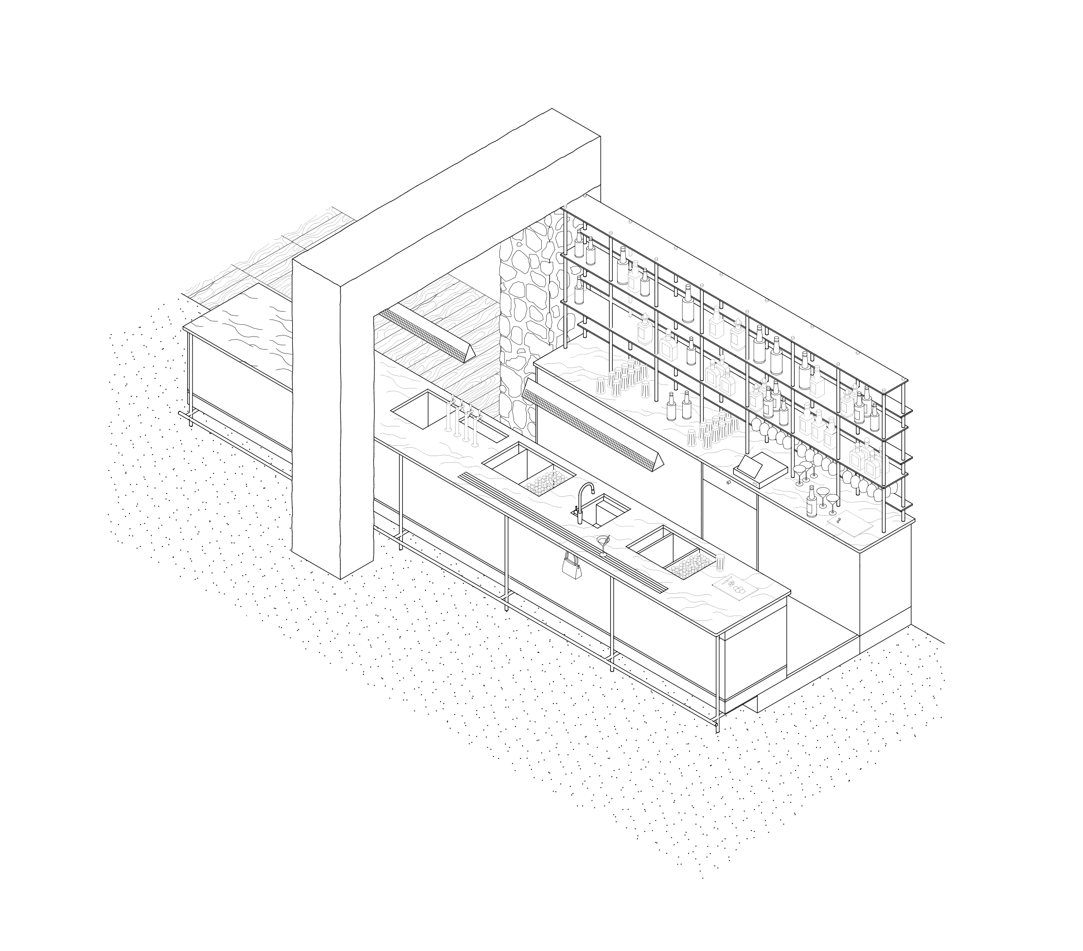 In this second instalment of the Bottle Brothers chain of restaurants and bars, the same concept has been repeated: to strip the space down to a state of near-ruin, while incorporating luxurious elements as if they had been added unexpectedly. Here, the original walls and floors contrast with the bar's bespoke furniture and lighting, made from noble materials such as Calacatta marble and brass.
