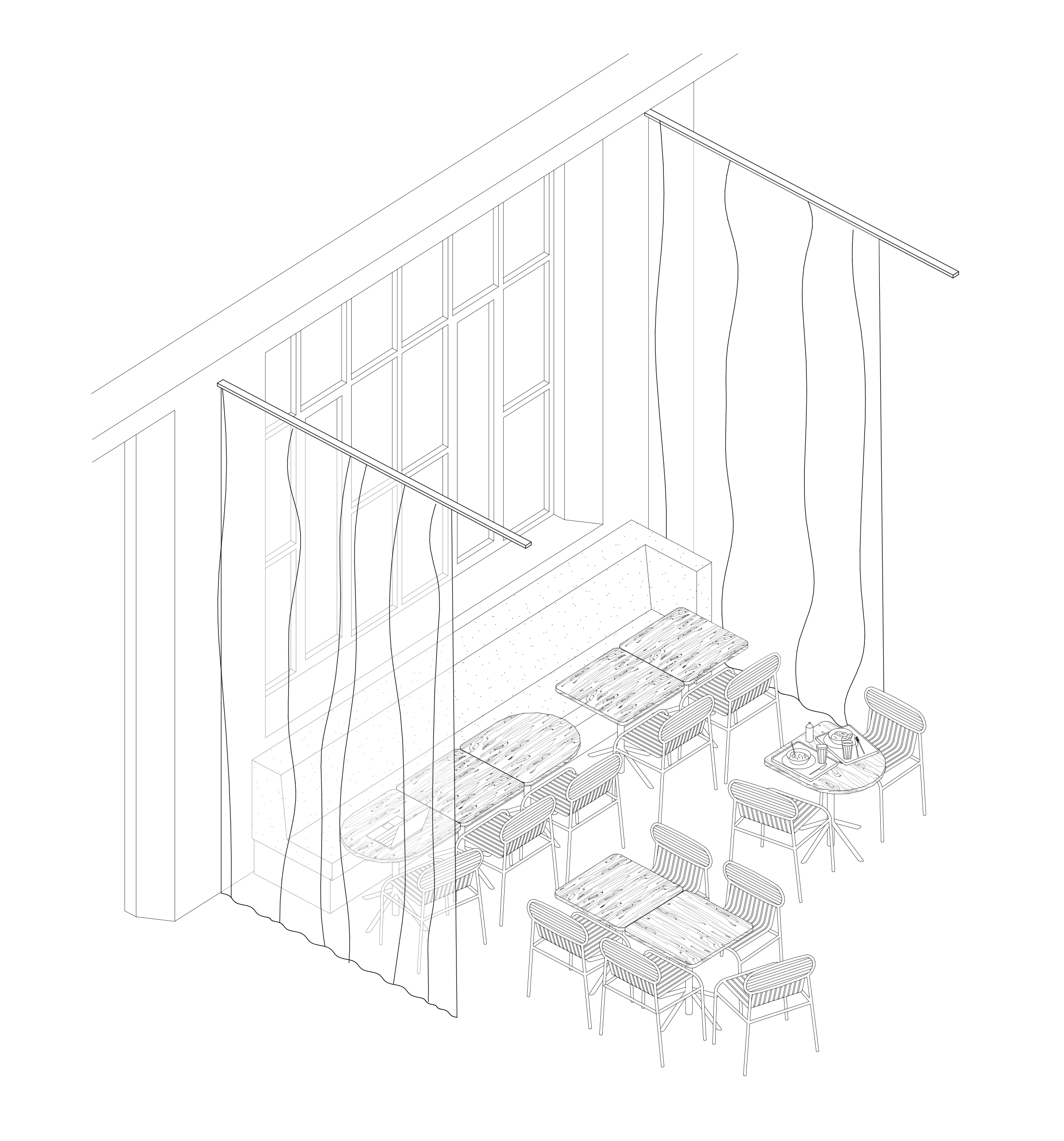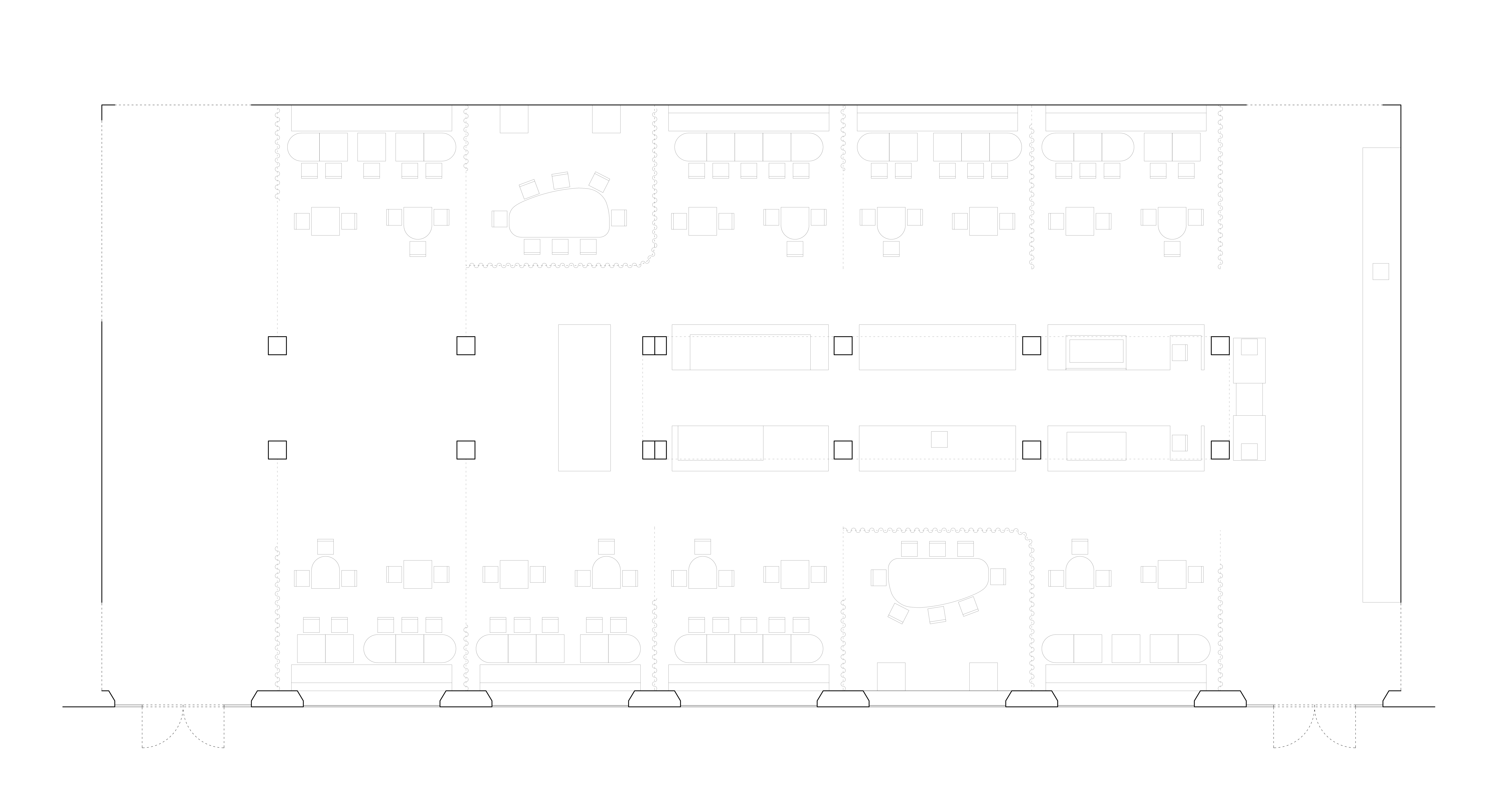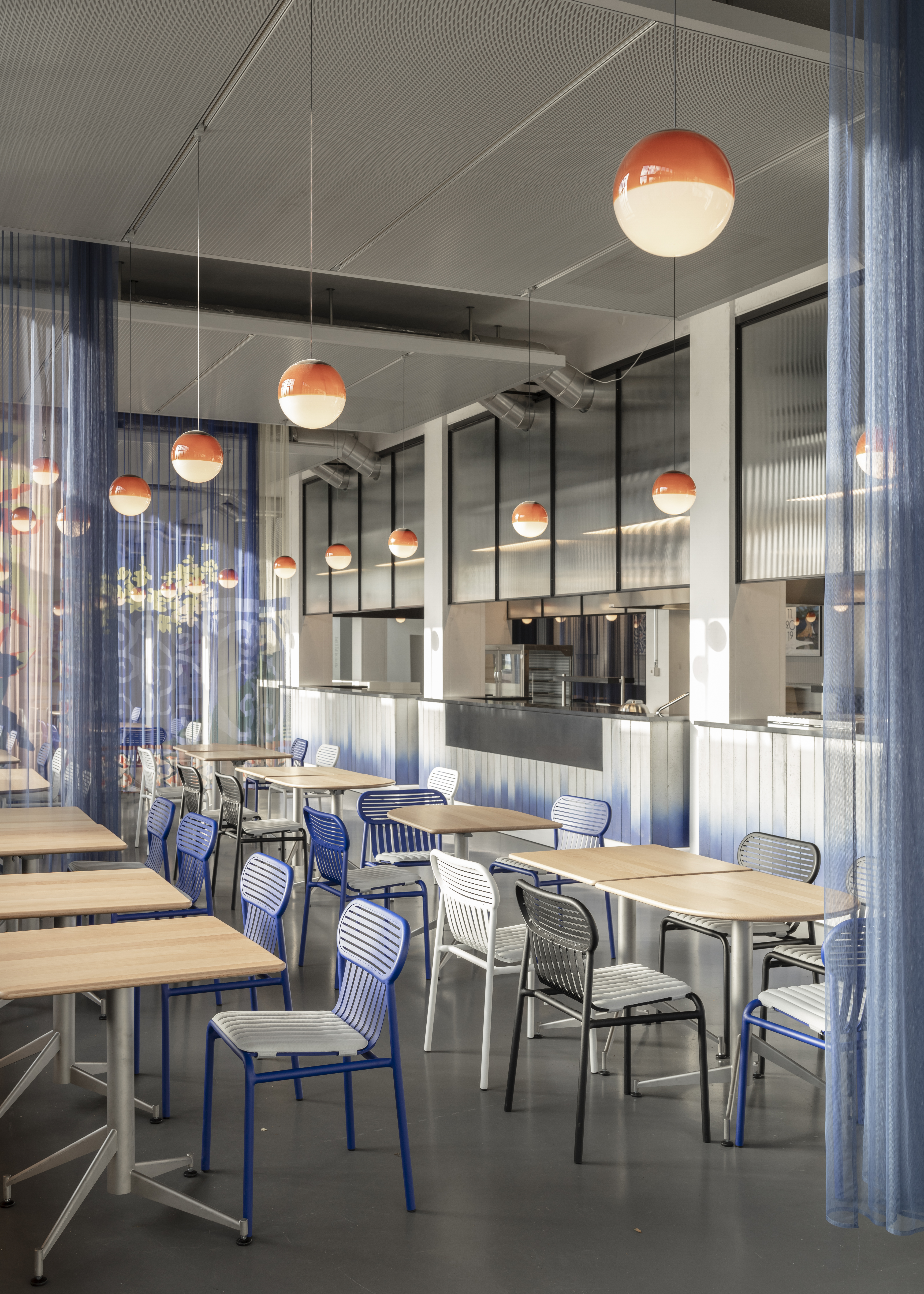 Half of the gigantic hall is now taken up by the kitchen, presentation and cashier area. The tables and chairs on either side of the hall are extremely modular. A collective space that can be reinvented according to the situation: events, lunches, coffee breaks, exhibitions or fashion shows?