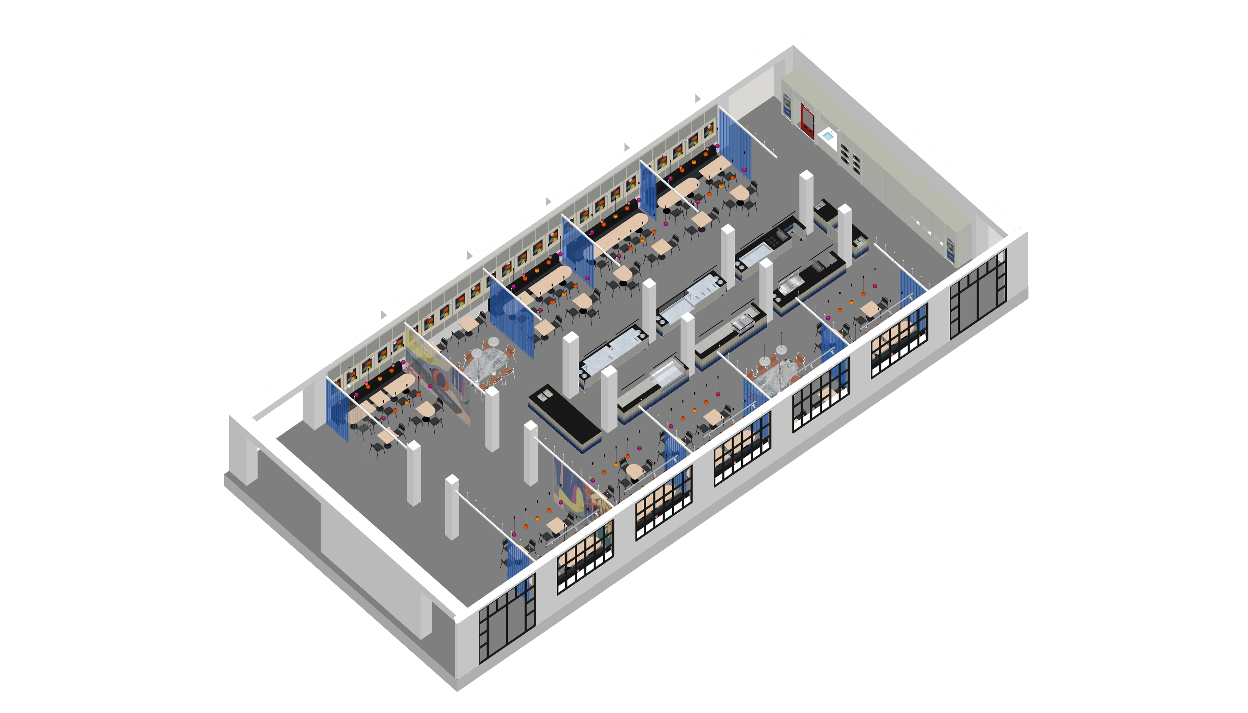 The aim of the Head cafeteria is to provide a dining area on the new campus of the University of Art and Design. It is located in Building H, which once housed the Tavaro factory and its Elna sewing machine assembly line. From 2017, this landmark of 20th-century industrial architecture in Geneva will become a place of creation, exhibition and training for students in the Interior Architecture and Space Design, Visual Communication and Illustration departments.
