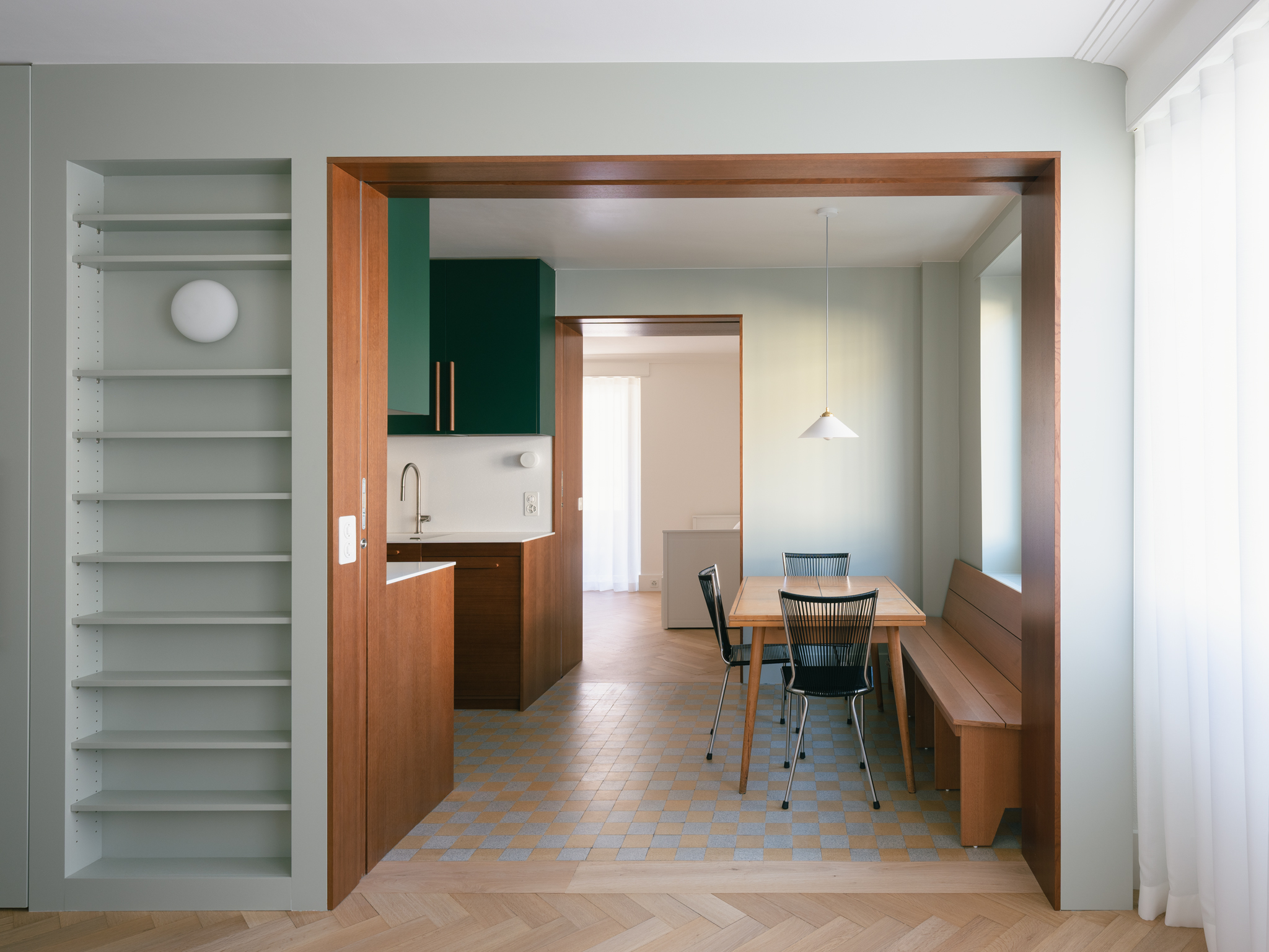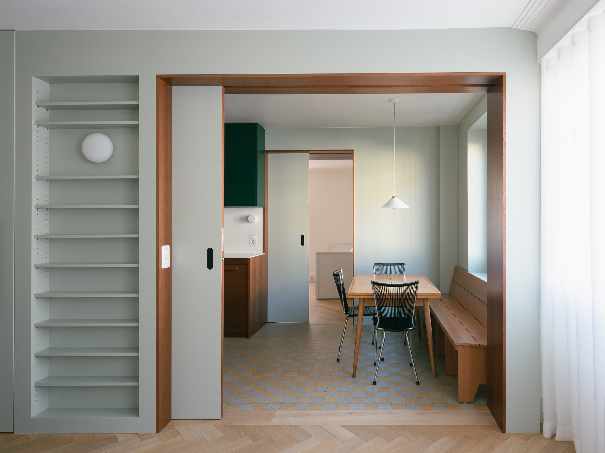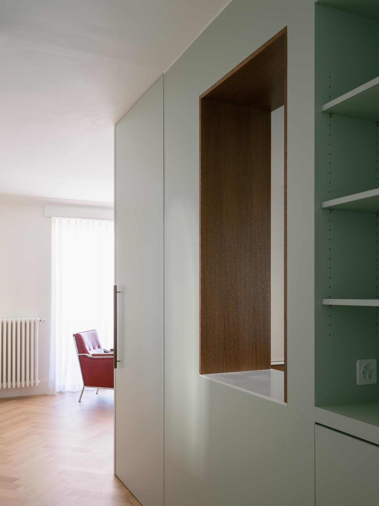 Our trick? A central kitchen box, the true beating heart of the space. Around it, the apartment unfolds into a mosaic of spatial sequences, each adaptable to modulate openness and privacy according to needs. A subtle interplay of sliding doors and perspectives, to harmoniously orchestrate life and home.