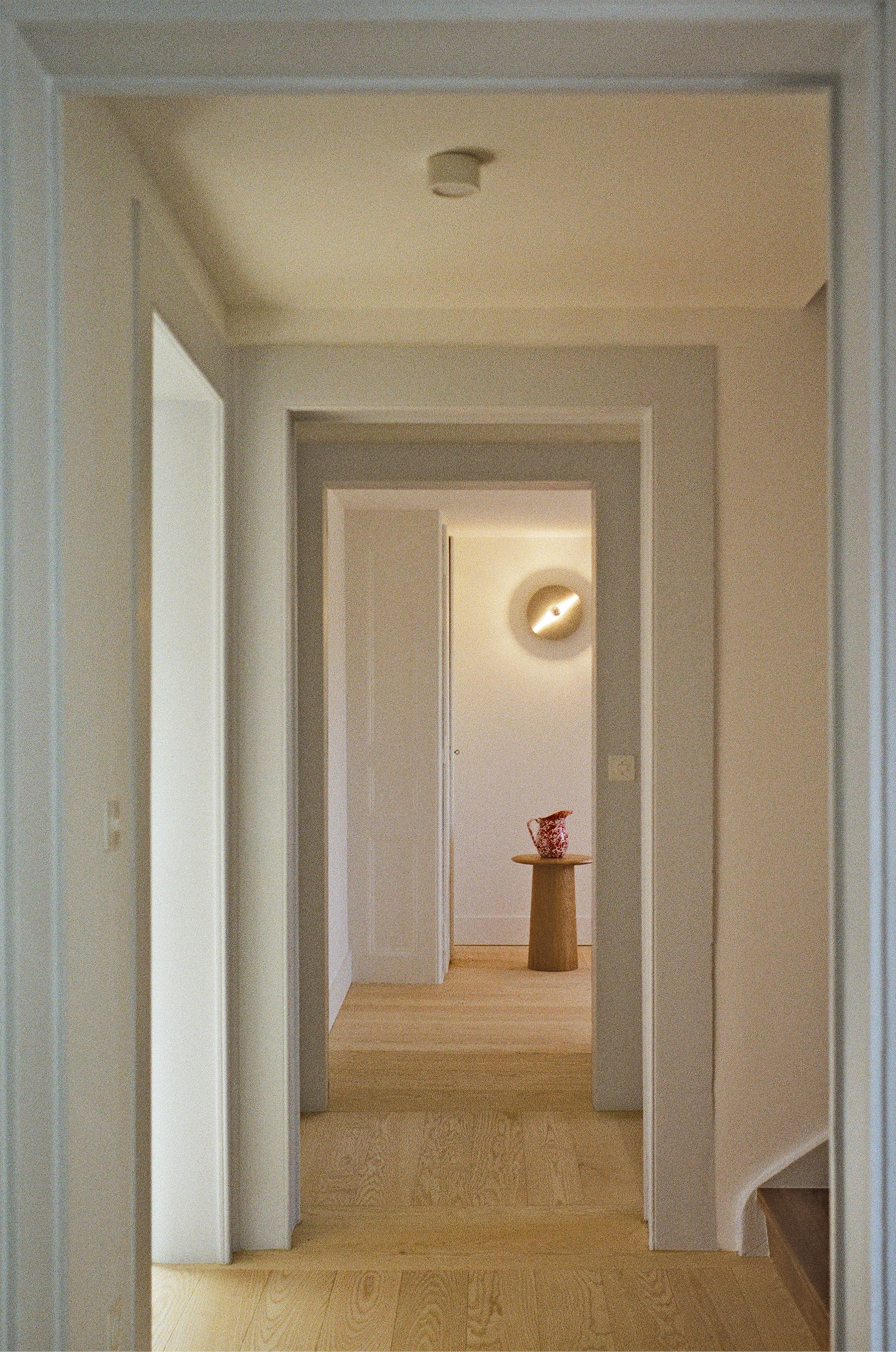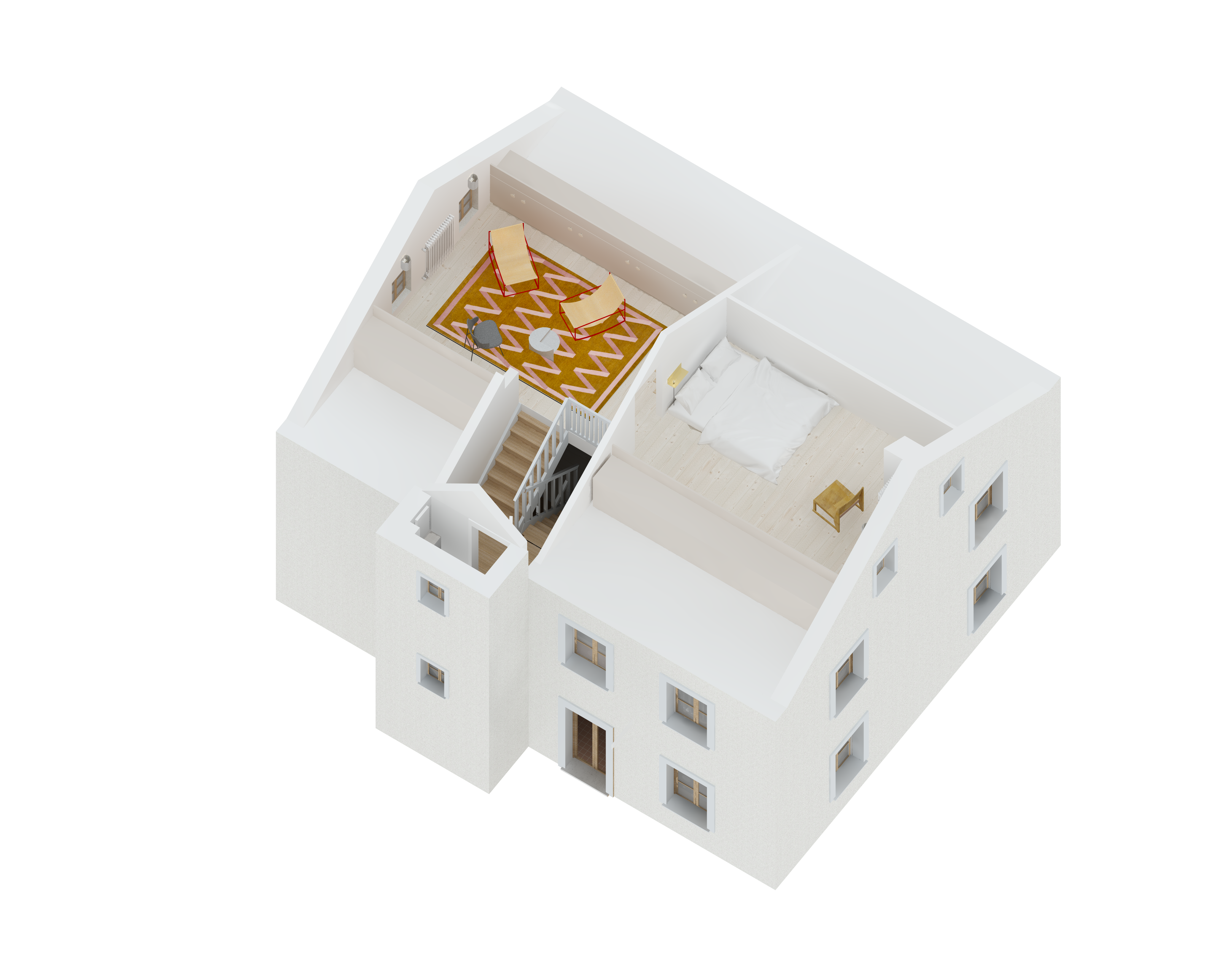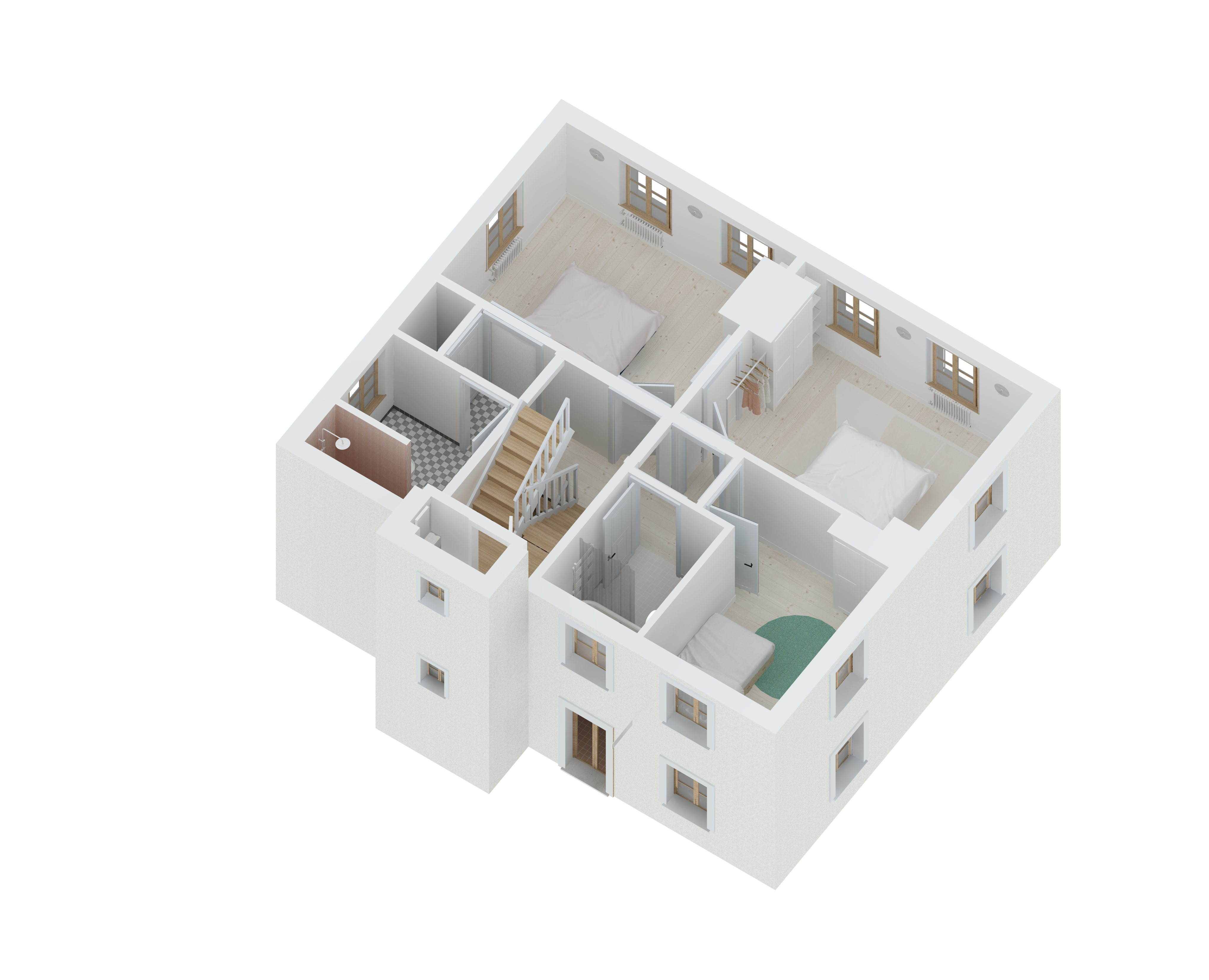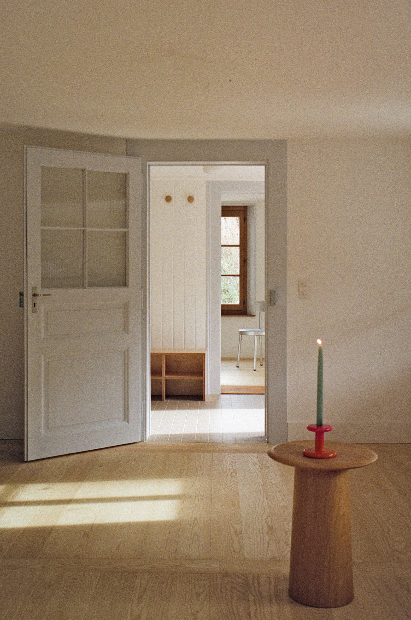 Care was taken in the choice of materials to respect the language of the surrounding and traditional buildings: lime rendering, old-fashioned oak windows, etc. Existing elements were preserved as much as possible and renovated or relocated, such as the doors on the first floor, which were reused to create the new bathrooms.