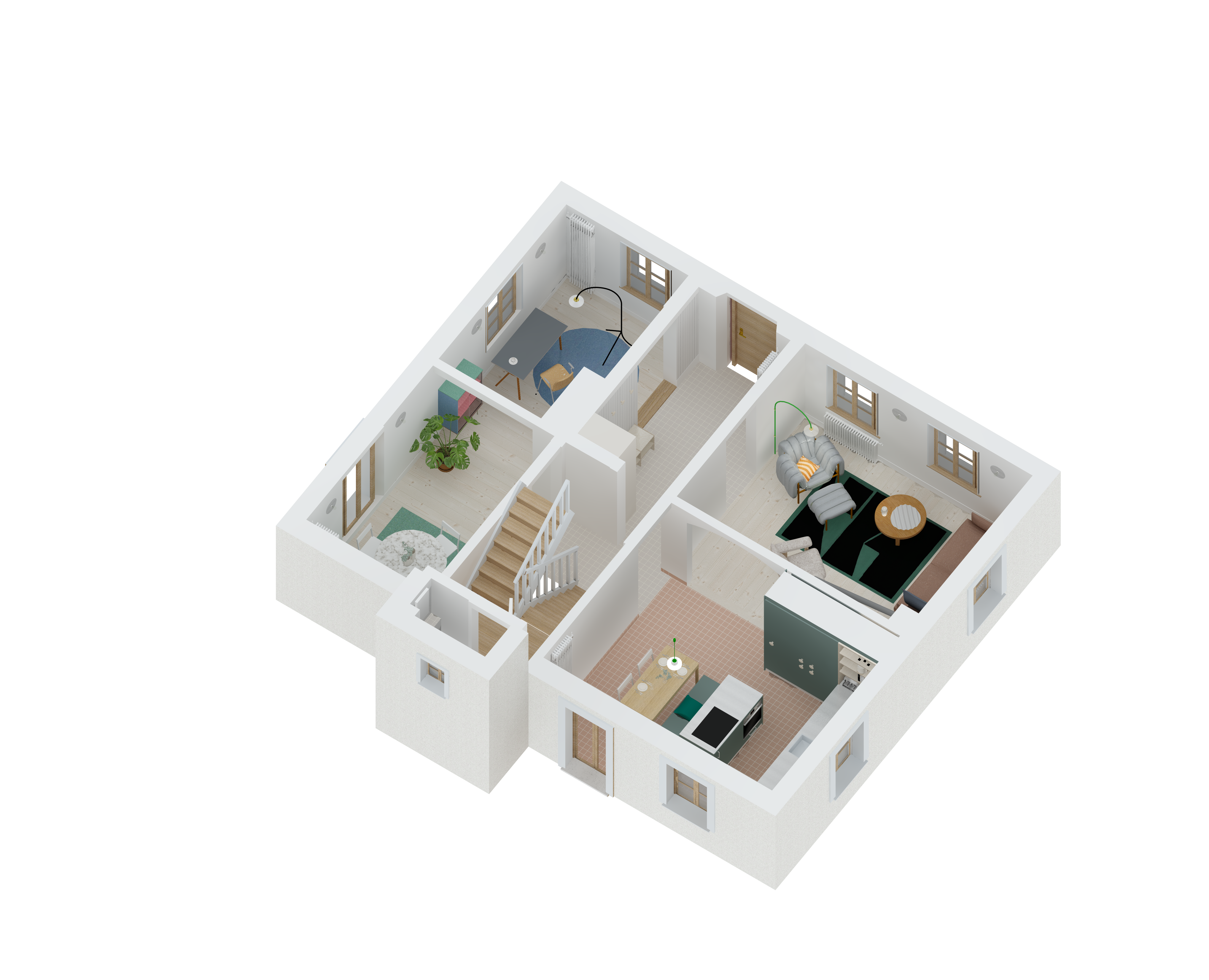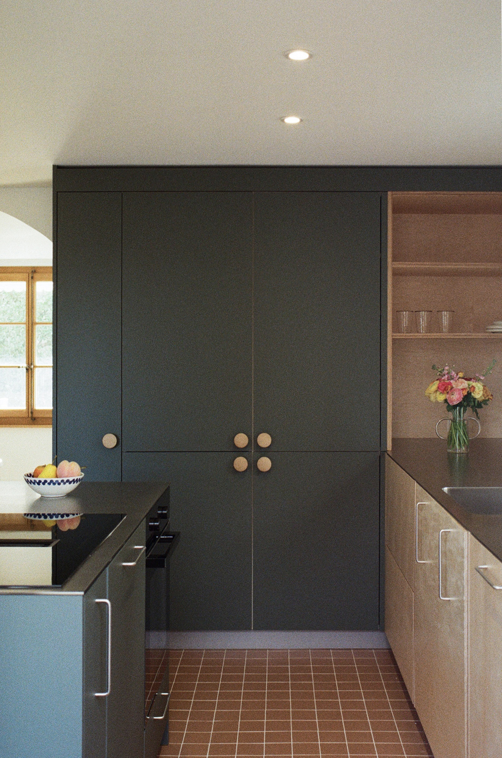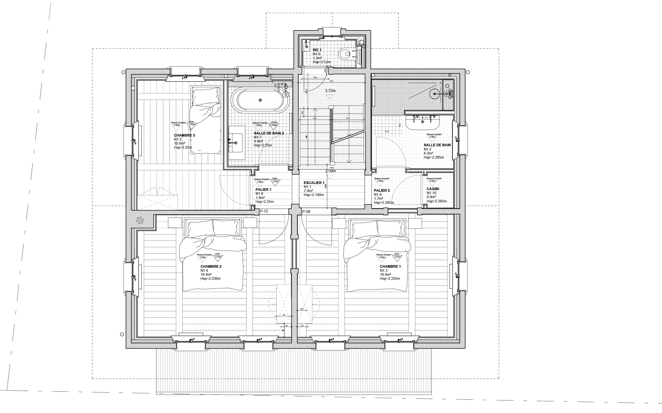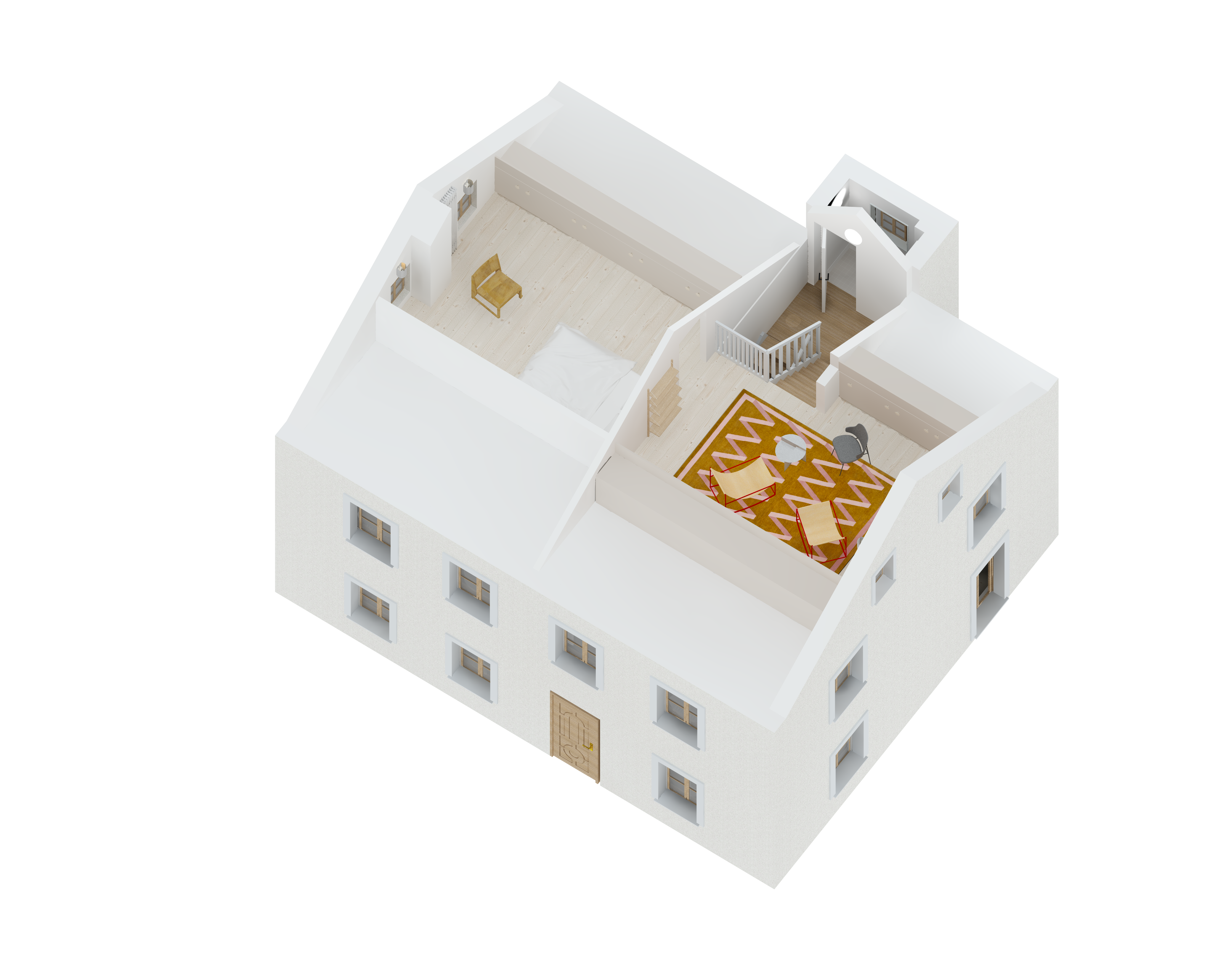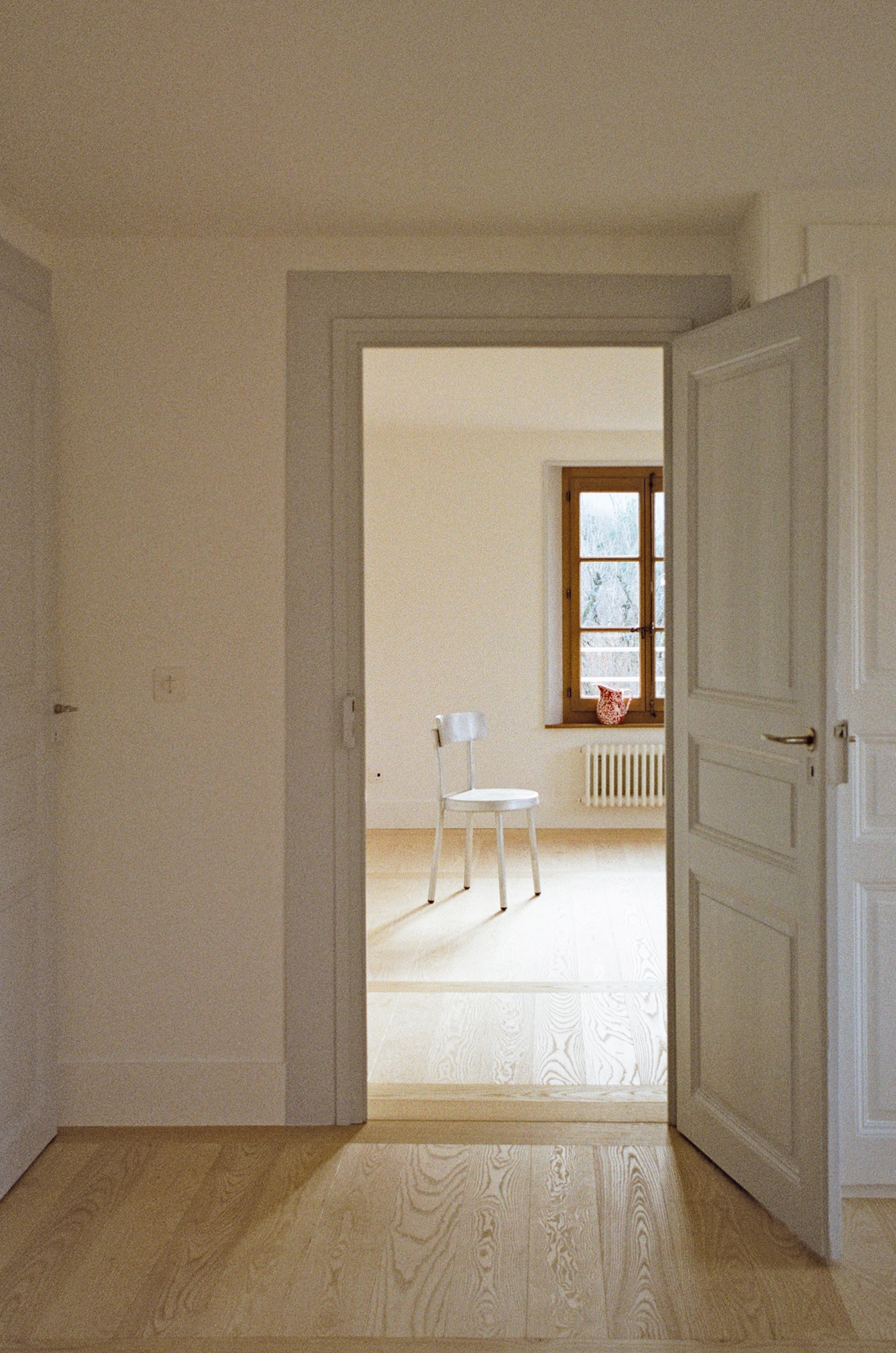 Care was taken in the choice of materials to respect the language of the surrounding and traditional buildings: lime rendering, old-fashioned oak windows, etc. Existing elements were preserved as much as possible and renovated or relocated, such as the doors on the first floor, which were reused to create the new bathrooms.