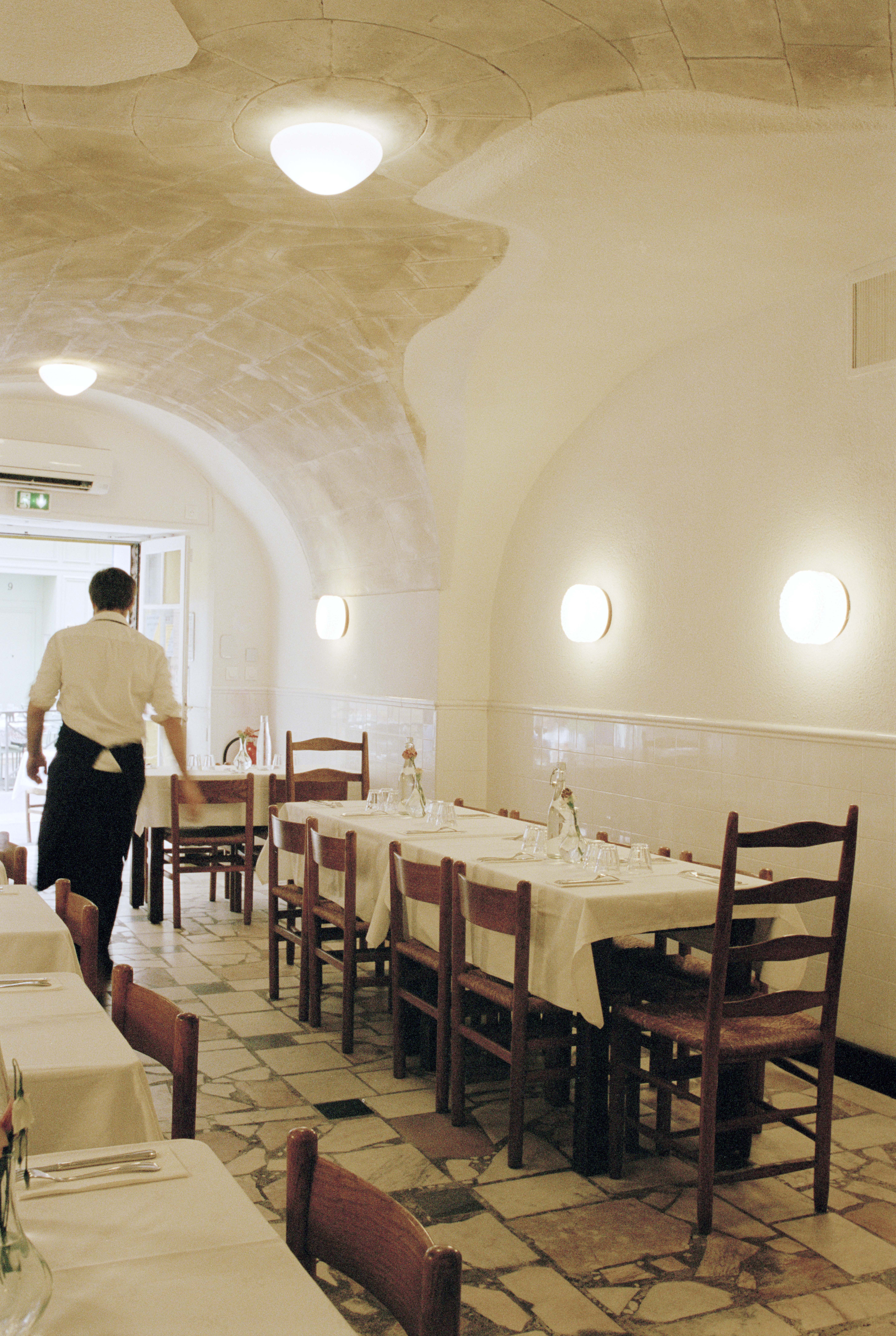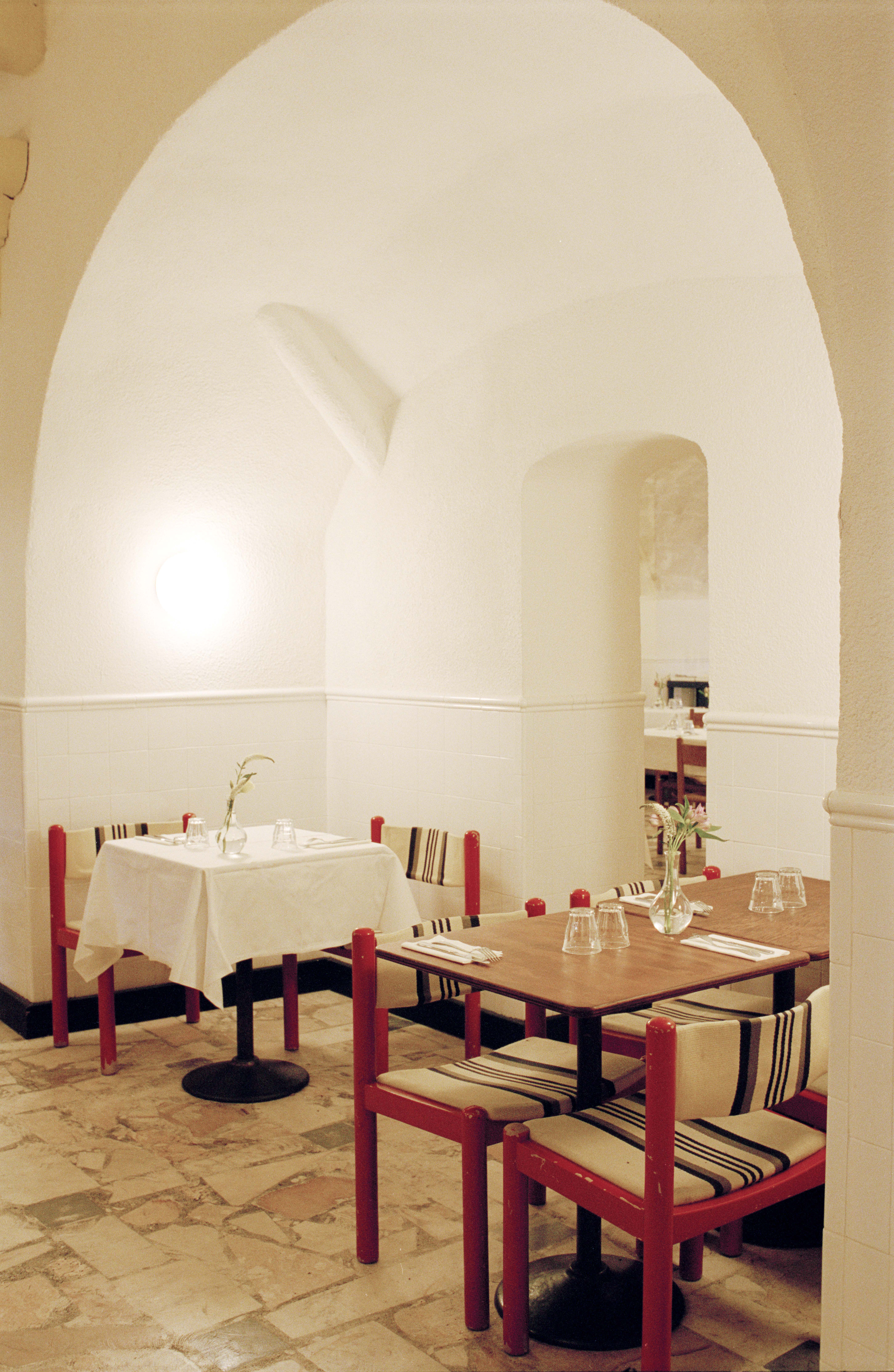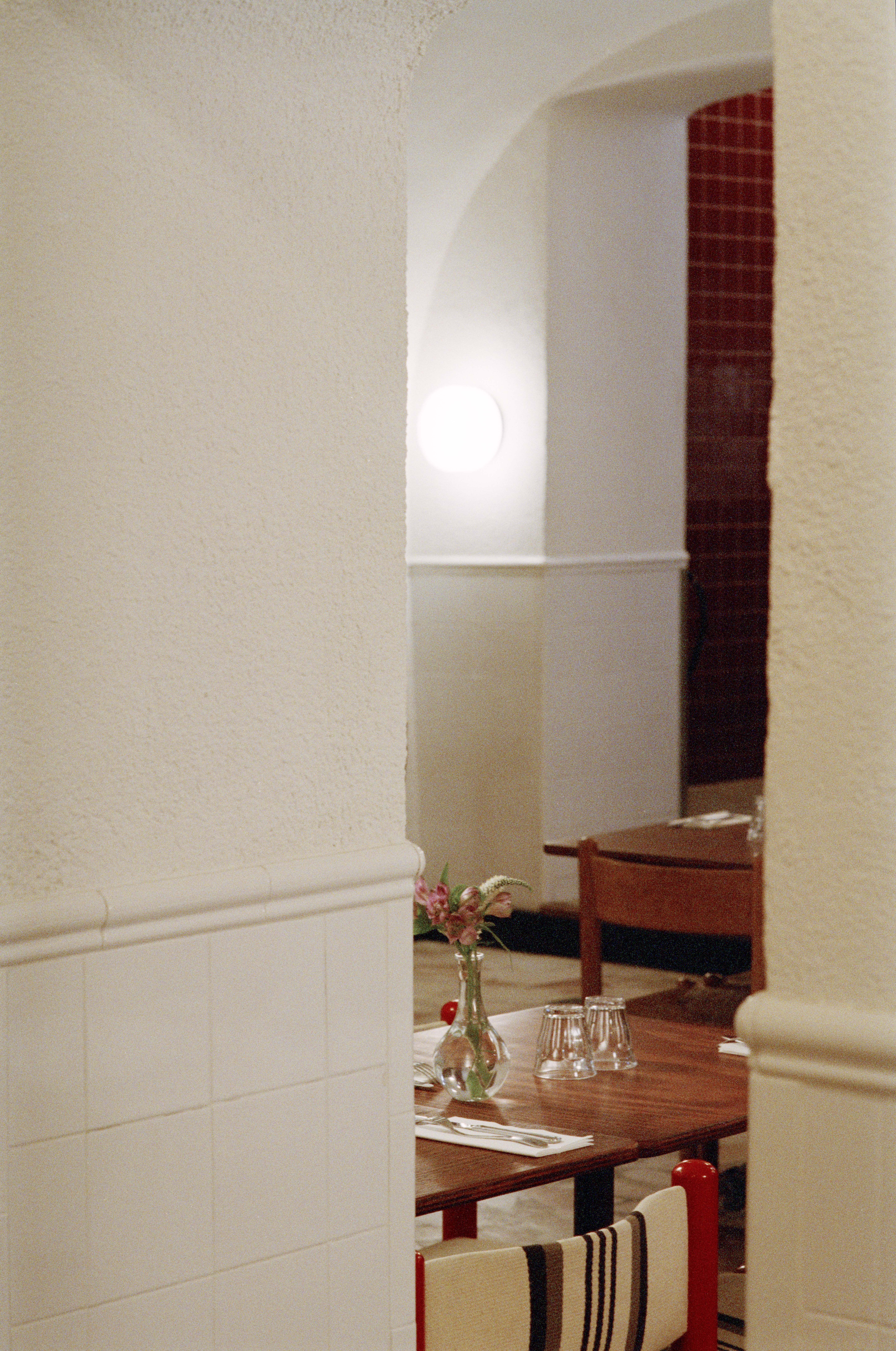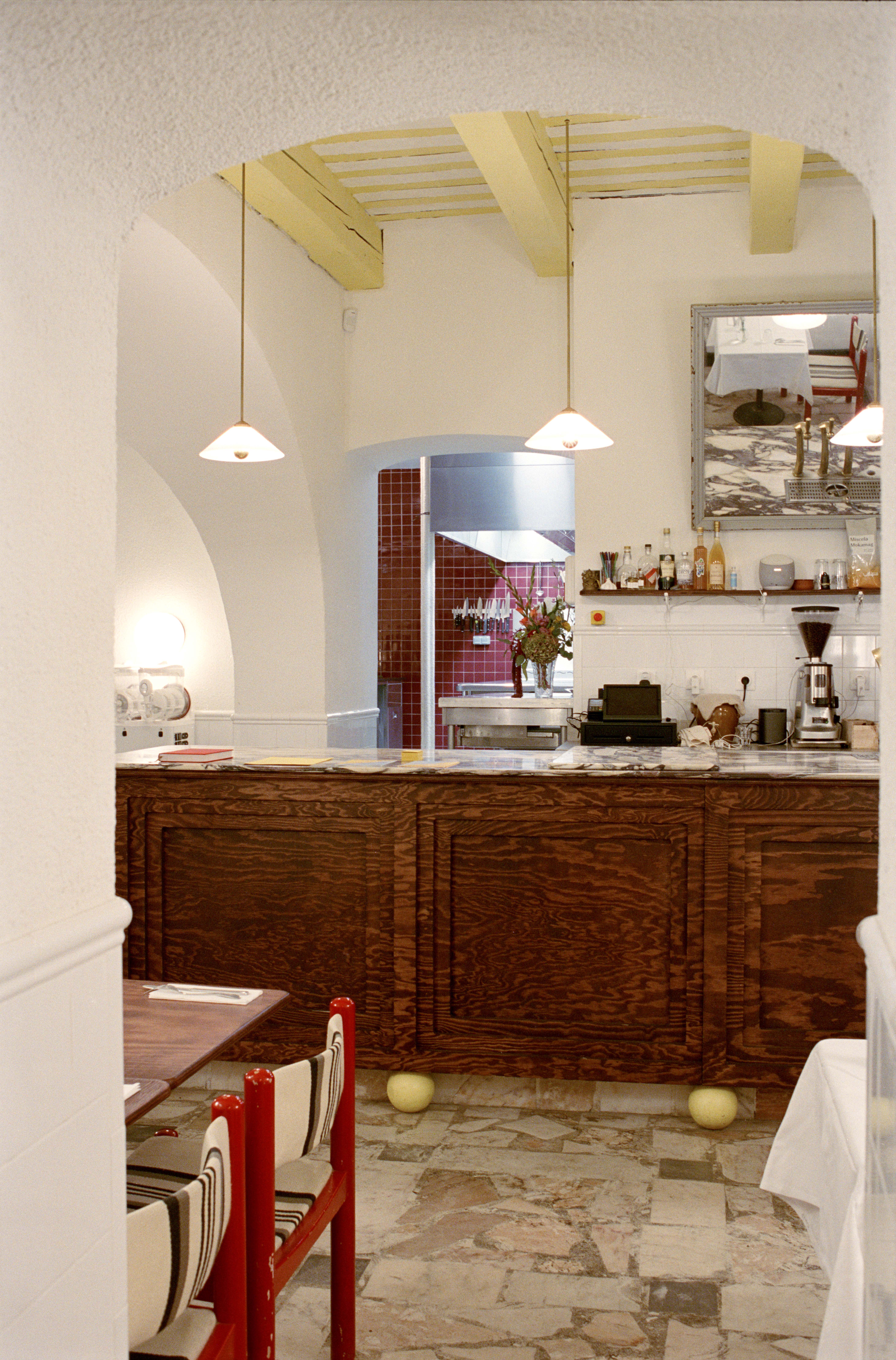 L'Idéal (Marseille, France) is a delicious collage of unexpected elements. A façade as it appears, found marble and, of course, bright white tablecloths. Arches, Calacatta marble and psychedelic pine, a nod to Ettore Sottsass, evoke the charm of Italian trattorias. The kitchen is bursting with creativity : raspberries abound, lemon cream stripes adorn the ceiling, with a hint of Gio Ponti nearby. A wood-fired oven, a handy Zizou and a steaming coffee machine create a dynamic atmosphere while the red mullet cooks. A fresco à la Jérôme Bosch - or almost - adds to the eclectic atmosphere. Everything else is served at the table.