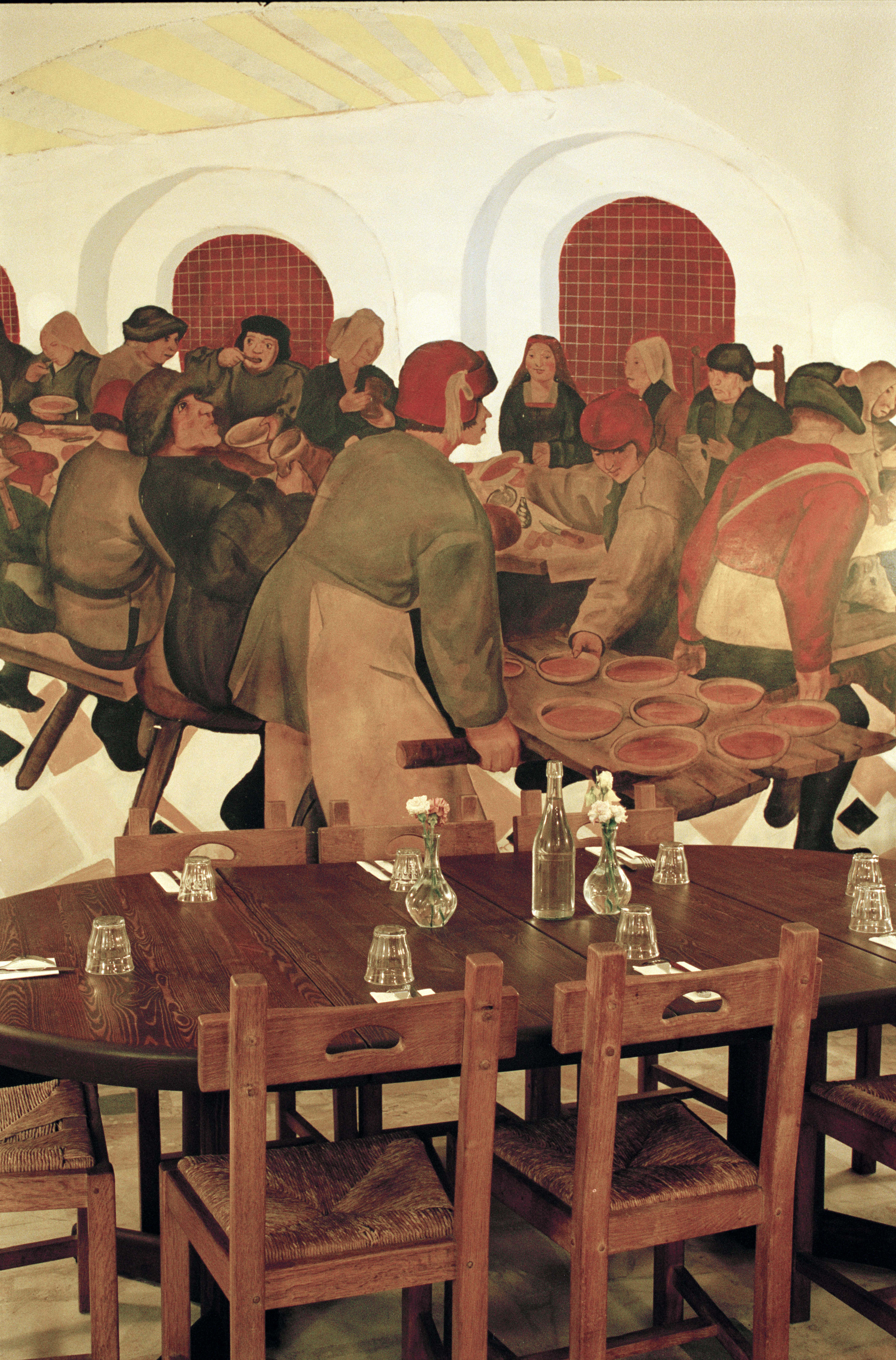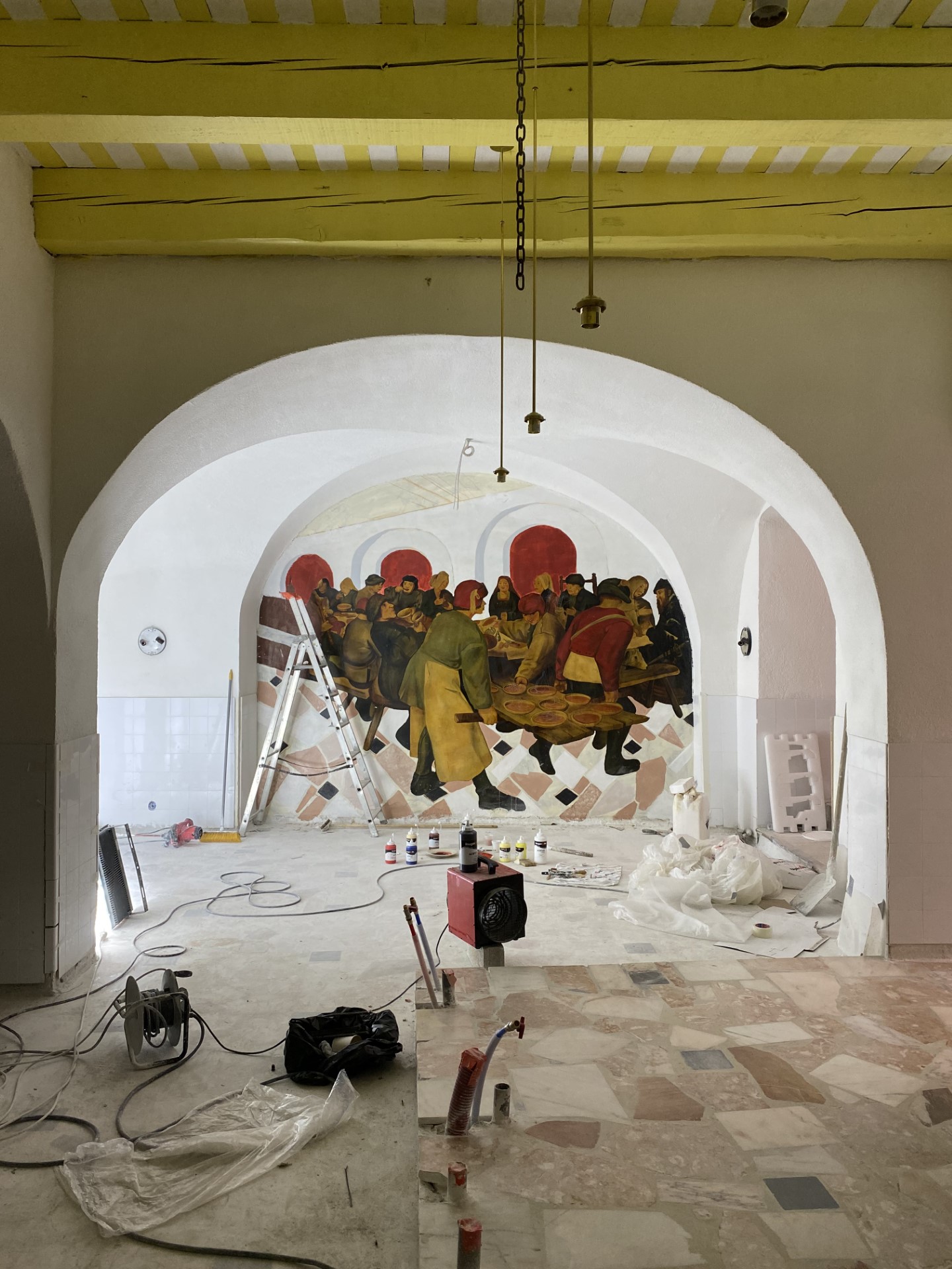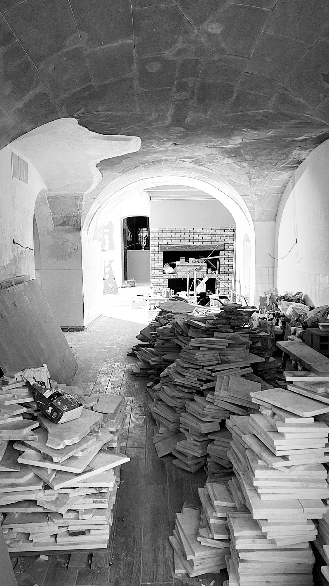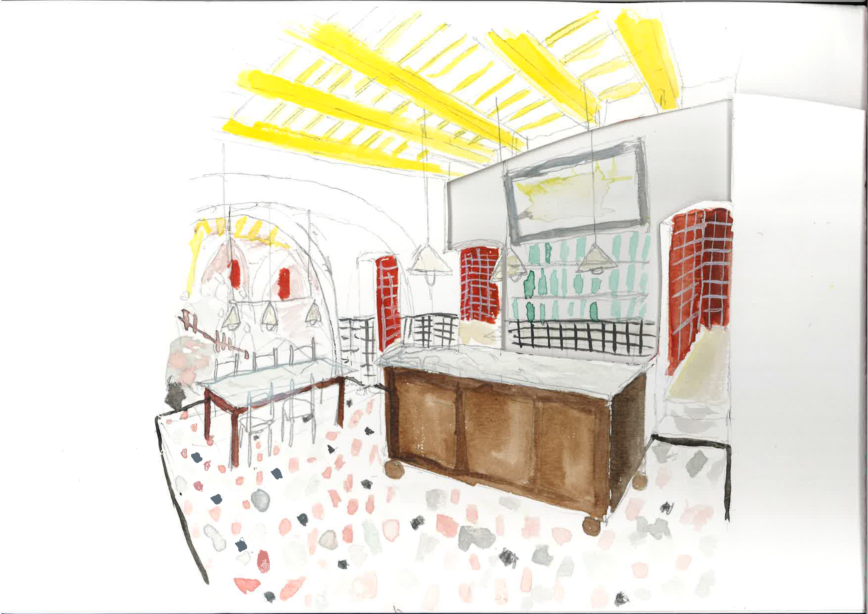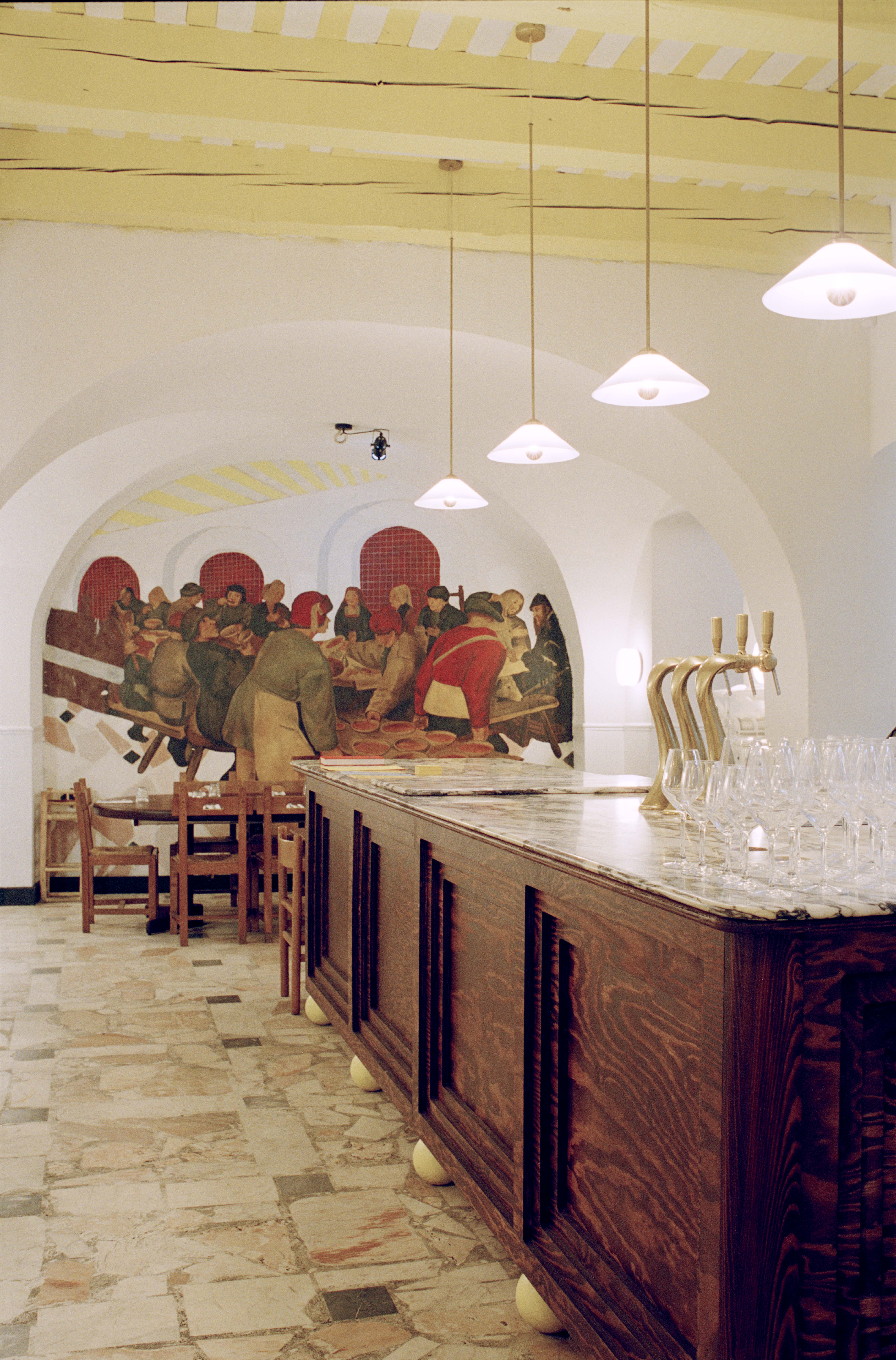 L'Idéal (Marseille, France) is a delicious collage of unexpected elements. A façade as it appears, found marble and, of course, bright white tablecloths. Arches, Calacatta marble and psychedelic pine, a nod to Ettore Sottsass, evoke the charm of Italian trattorias. The kitchen is bursting with creativity : raspberries abound, lemon cream stripes adorn the ceiling, with a hint of Gio Ponti nearby. A wood-fired oven, a handy Zizou and a steaming coffee machine create a dynamic atmosphere while the red mullet cooks. A fresco à la Jérôme Bosch - or almost - adds to the eclectic atmosphere. Everything else is served at the table.