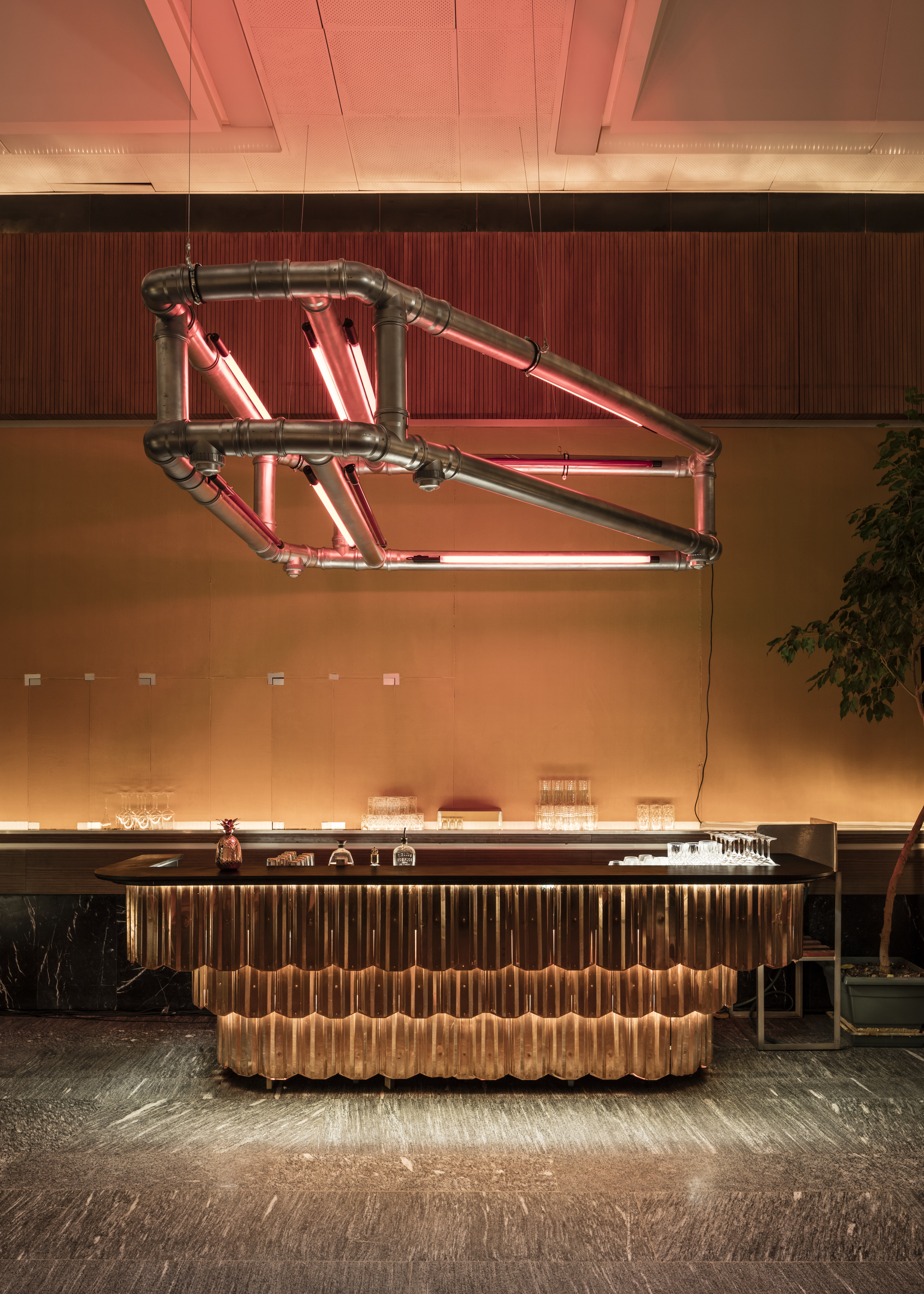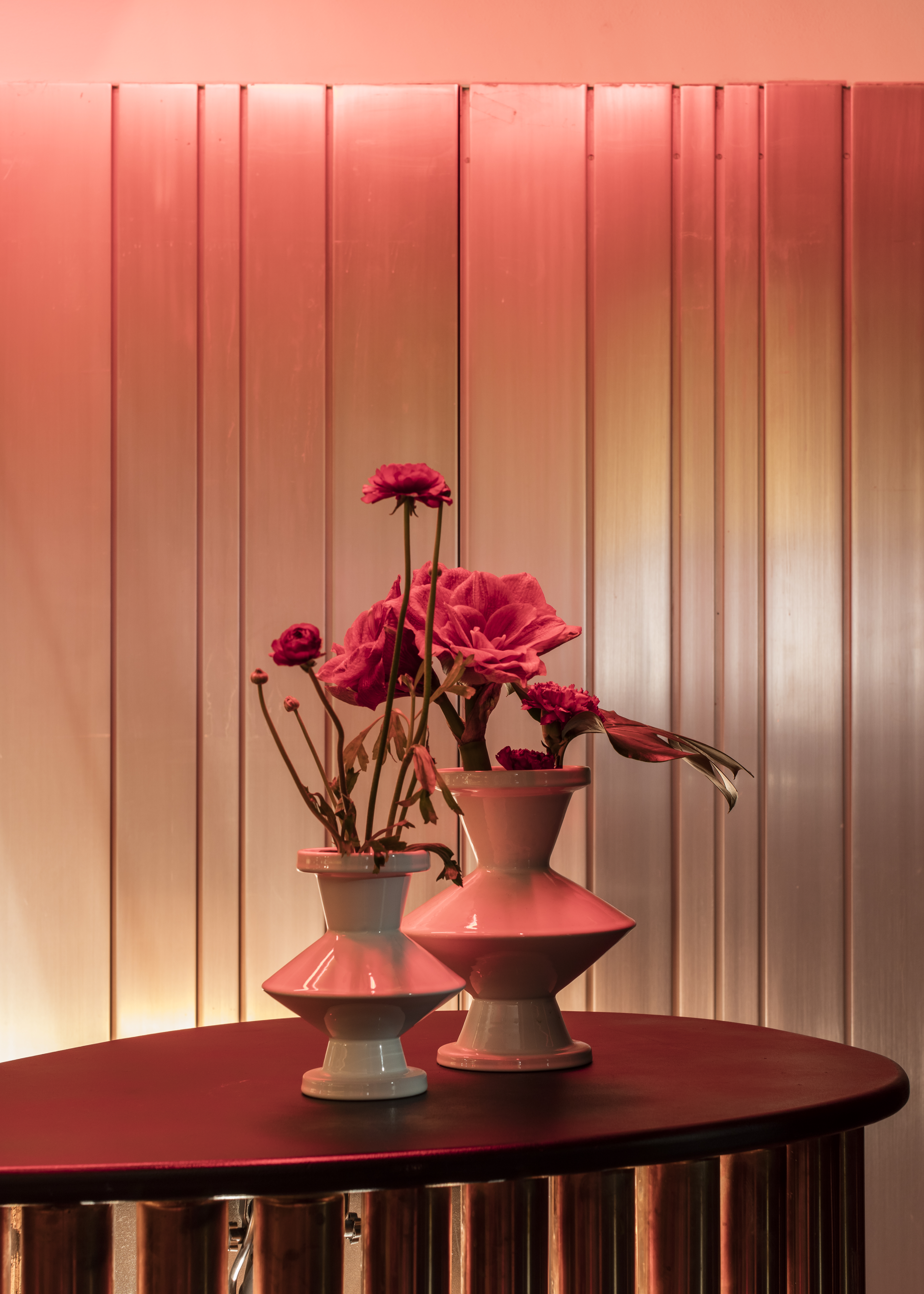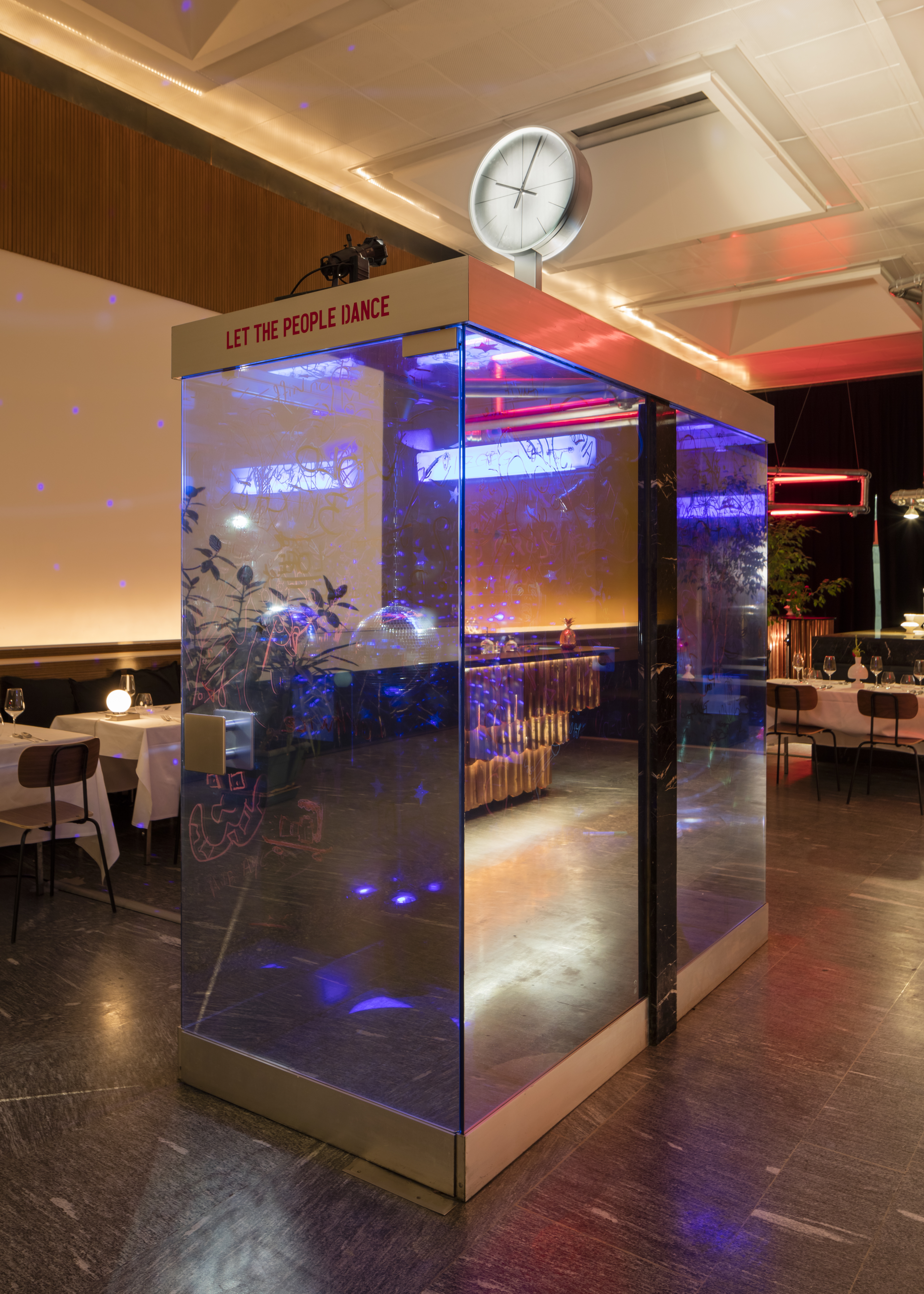 From the shape of the lamps to the selection of flowers and the dress of the waiters. The furniture and crockery have been specially acquired and designed for the occasion. The immersive and mysterious experience is accentuated by the use of double mirrors and motion detectors that activate light and sound. In this orchestrated universe, the telephone boxes seem to invite guests to a discreet and secret dance.