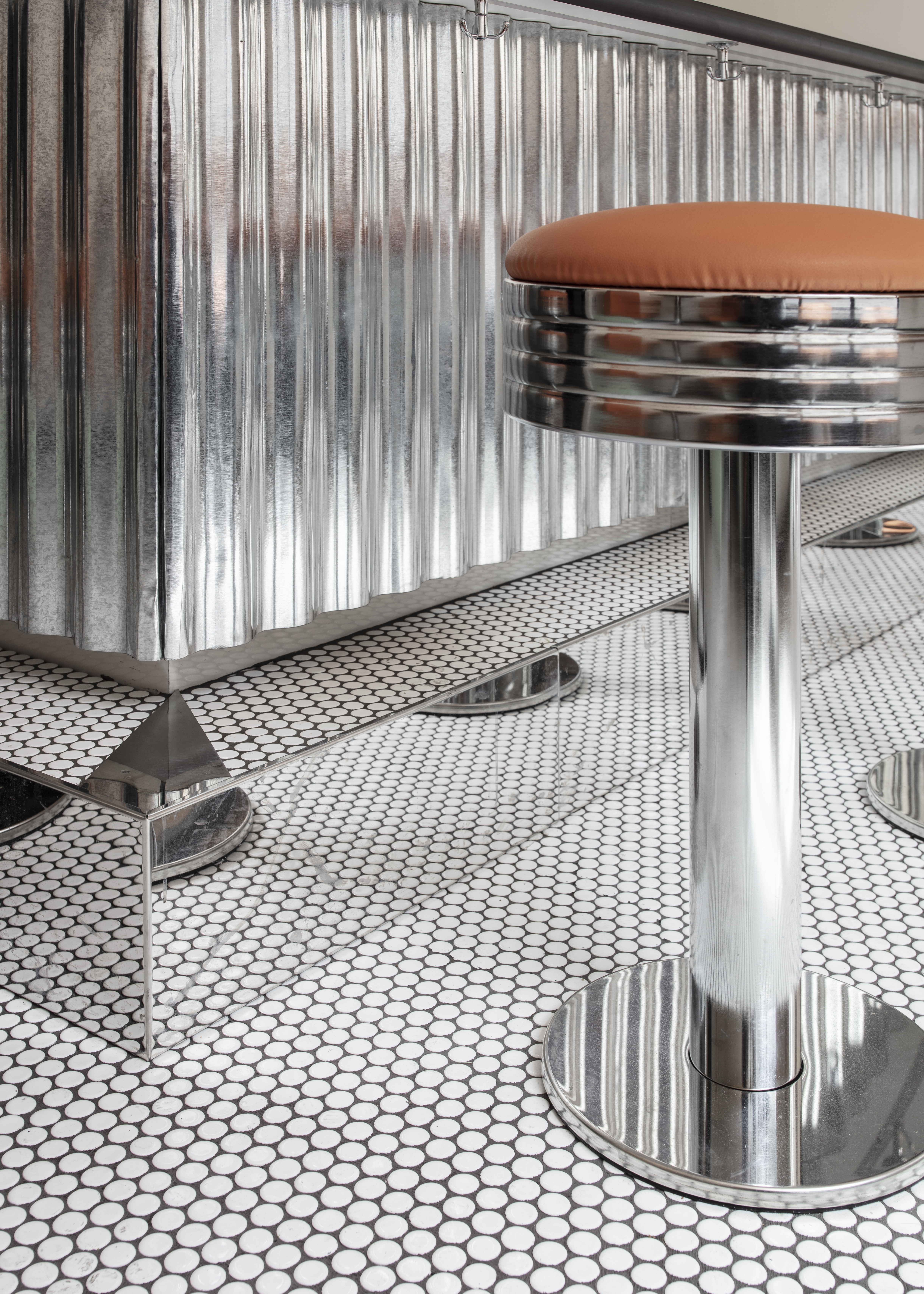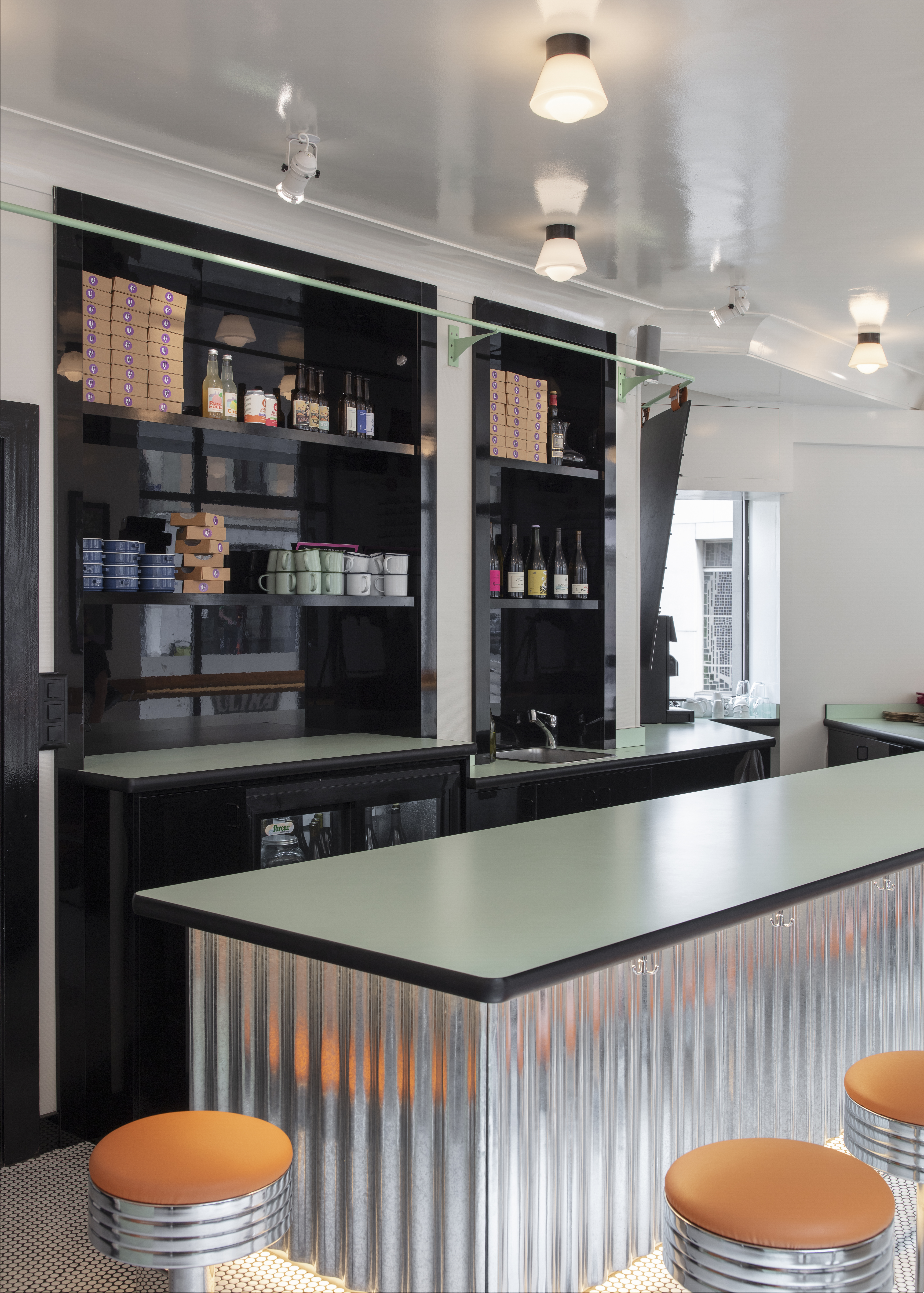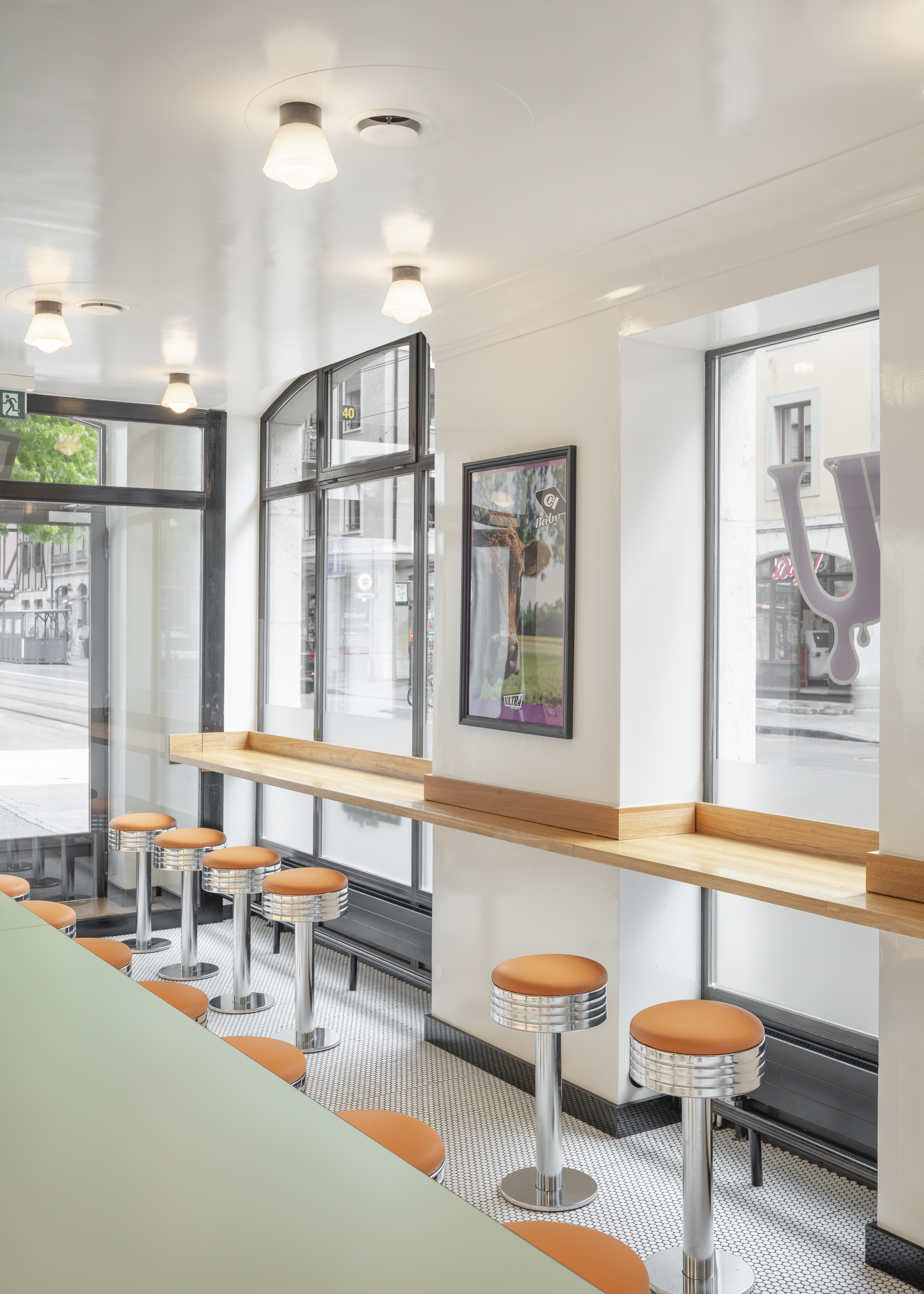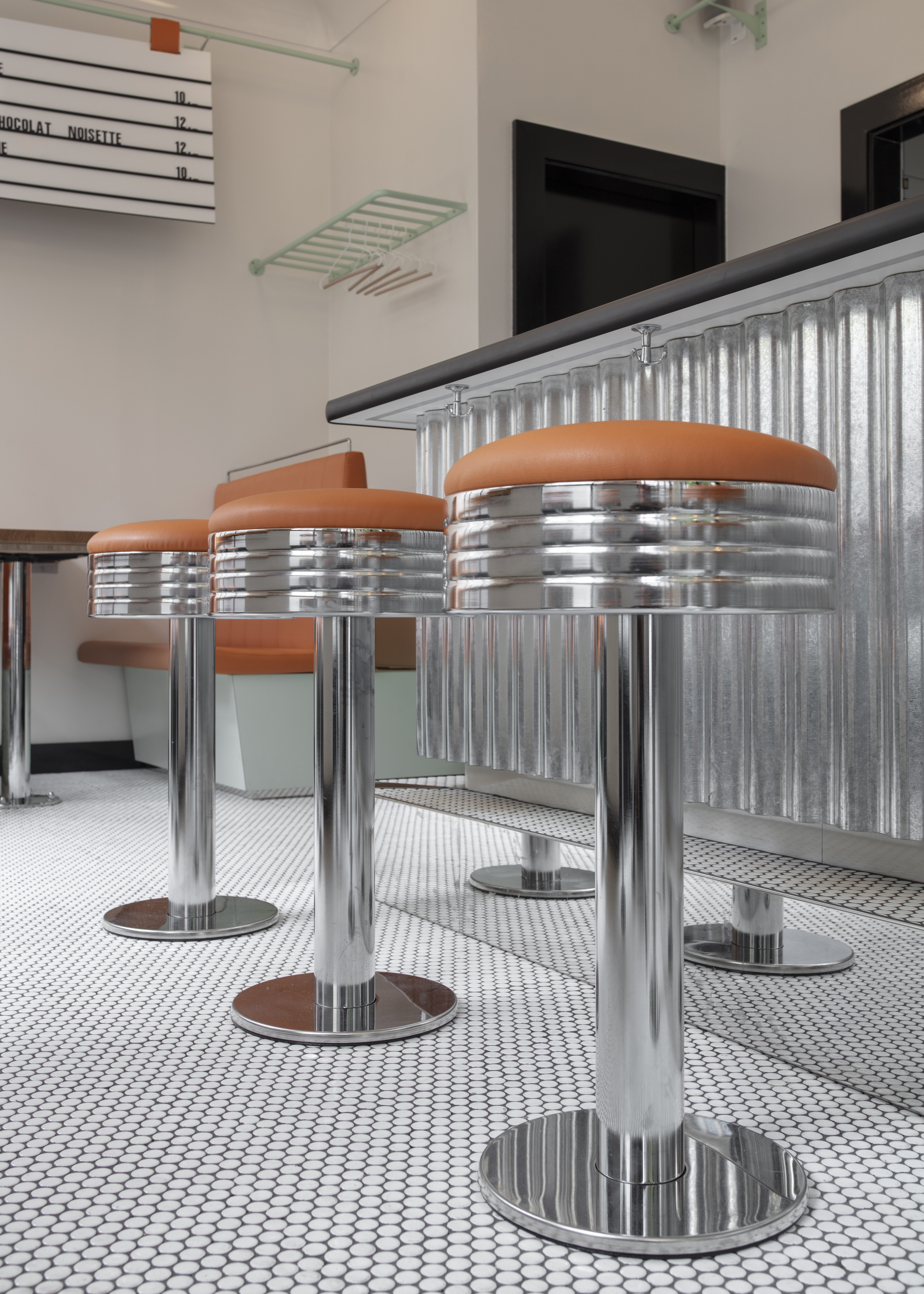 This space takes visitors on a journey through time, revisiting American traditions with a contemporary twist. It recreates the atmosphere of 1960s diners, enriched with a European touch. The décor is dominated by the turquoise typical of the period, with a black and white chequered floor and retro-style banquettes. The spirit of the diner is reflected in nostalgic elements that have been modernised, such as the formica tables and metal stools dressed in cognac leather.