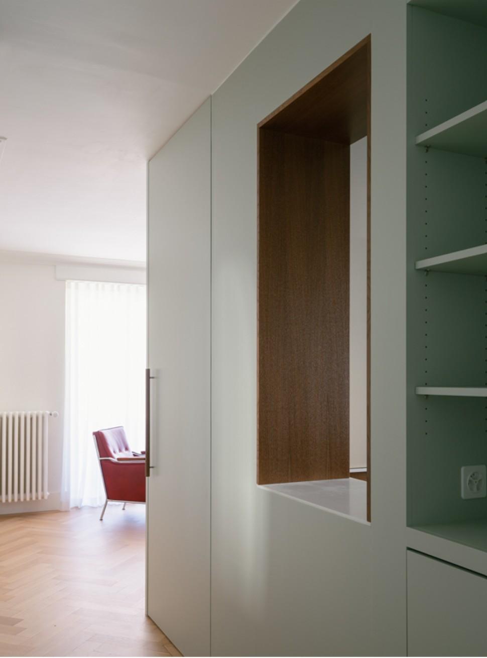 Our trick? A central kitchen box, the true beating heart of the space. Around it, the apartment unfolds into a mosaic of spatial sequences, each adaptable to modulate openness and privacy according to needs. A subtle interplay of sliding doors and perspectives, to harmoniously orchestrate life and home.