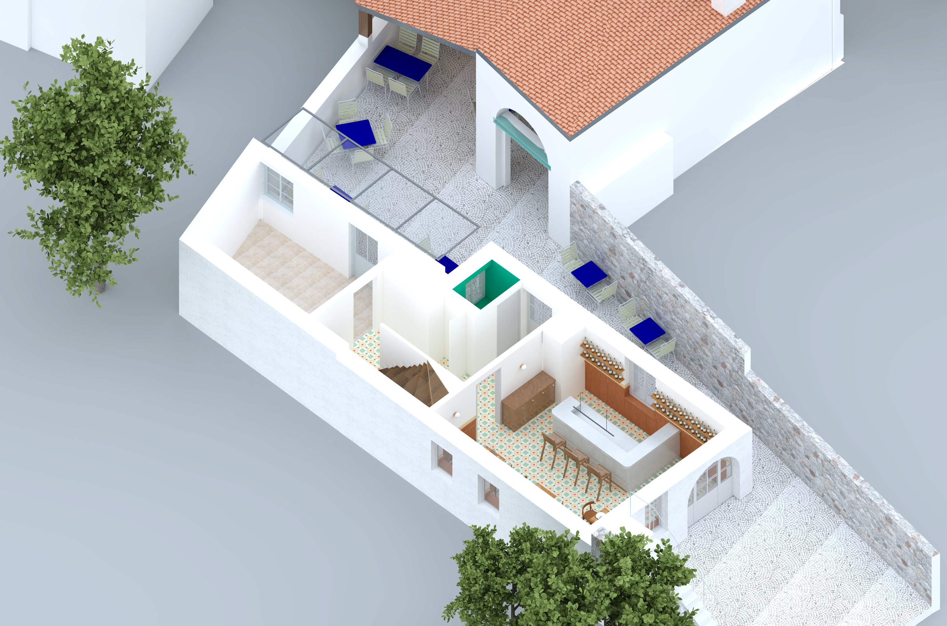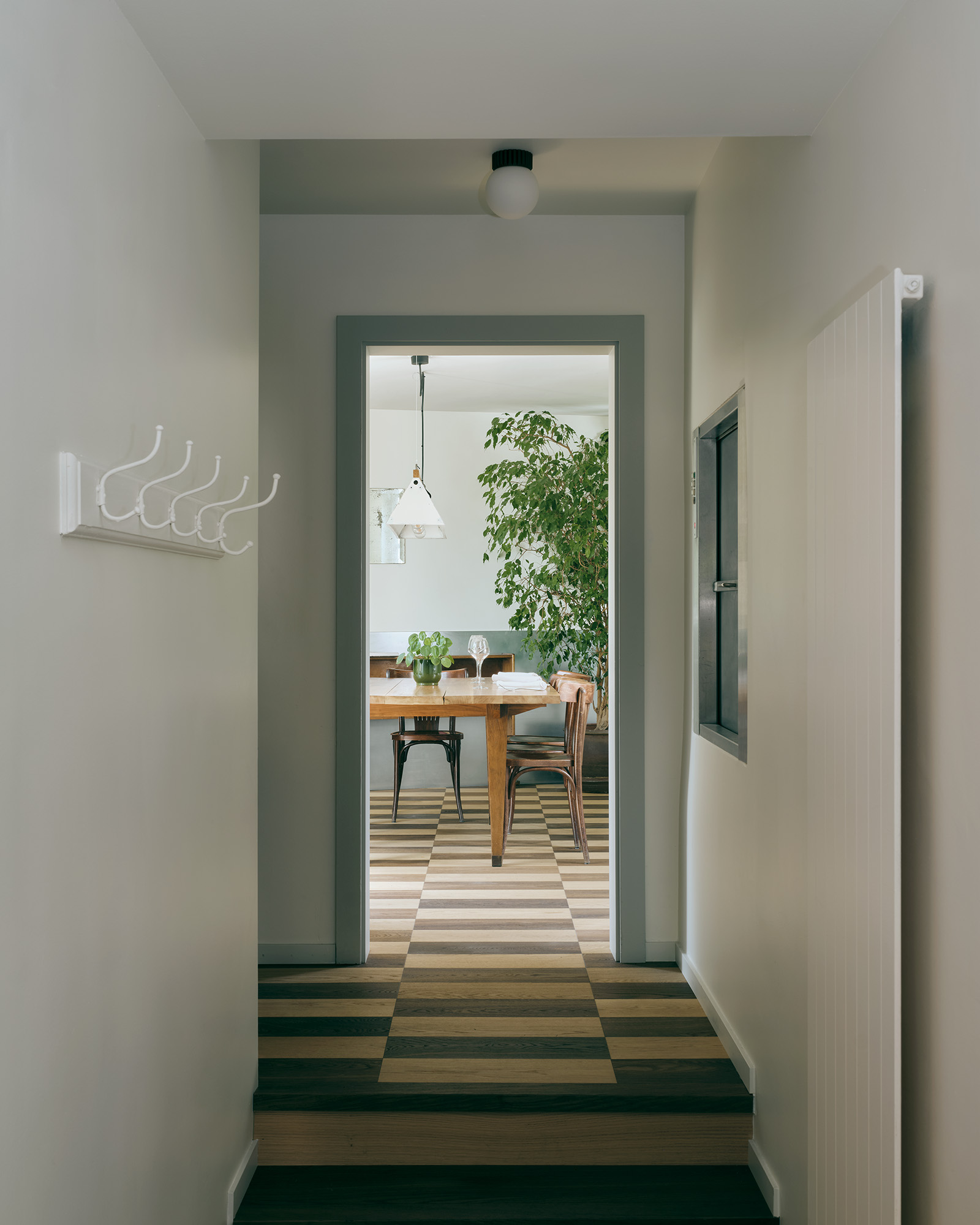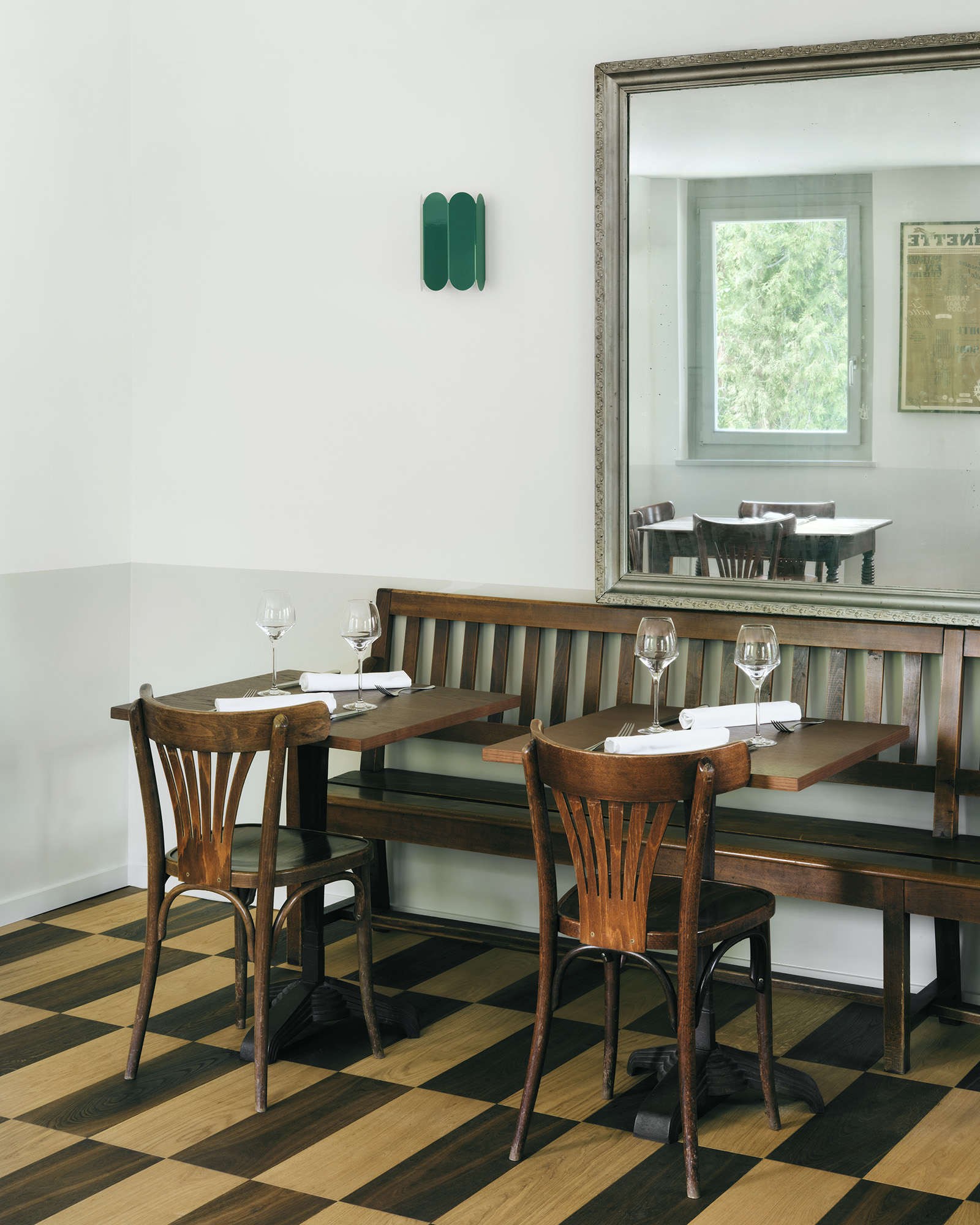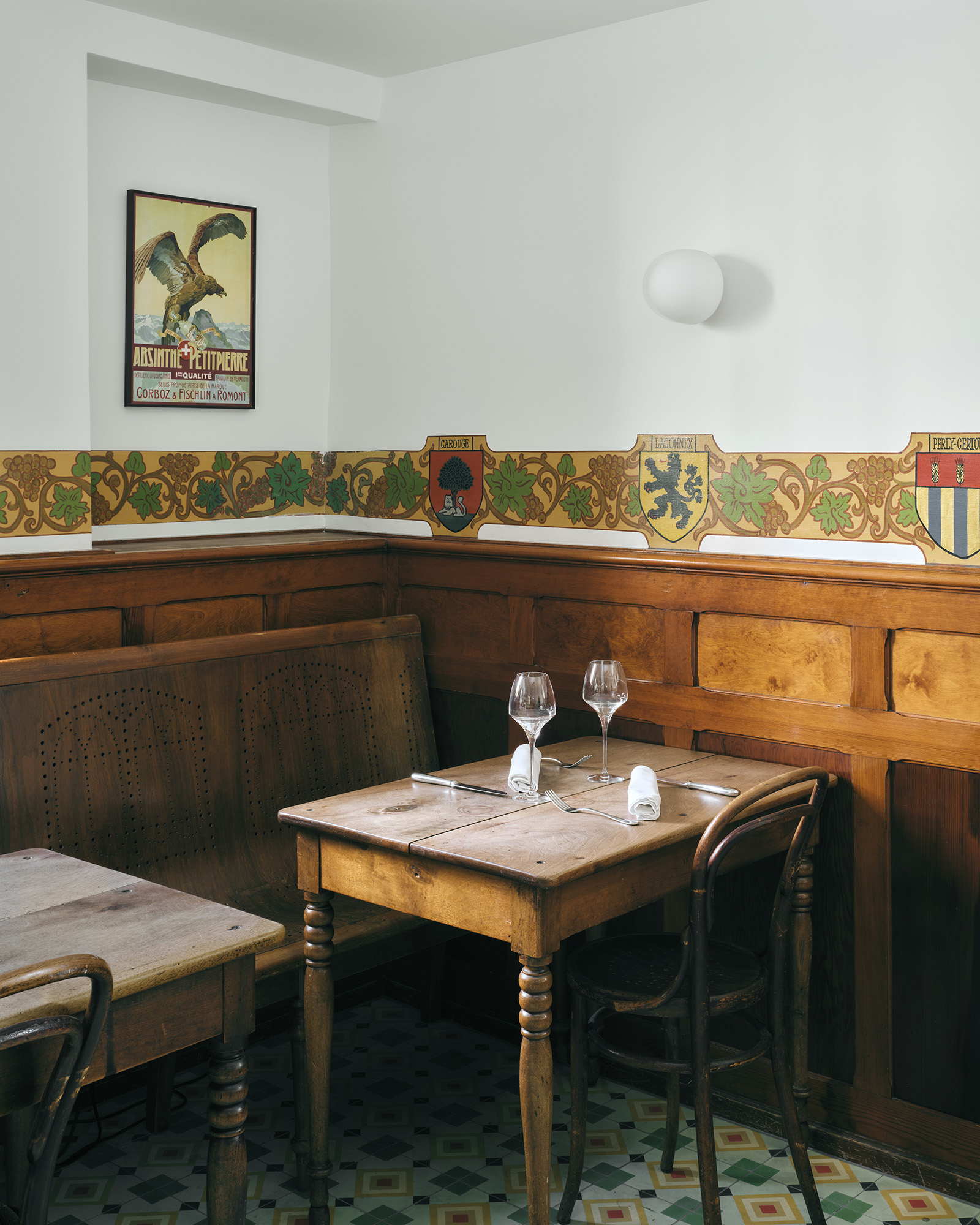 C’est en proposant des interventions simples, en conservant la patine des meubles, en restaurant les fresques historiques que le projet a été pensé. L’attention est portée sur la rénovation des sols, en proposant des pavés de ciment à motifs ou du parquet massif en damier. La lustrerie, elle, fait peau neuve pour apporter un changement contemporain, une touche nouvelle dans un ensemble aux habitudes bien établies.