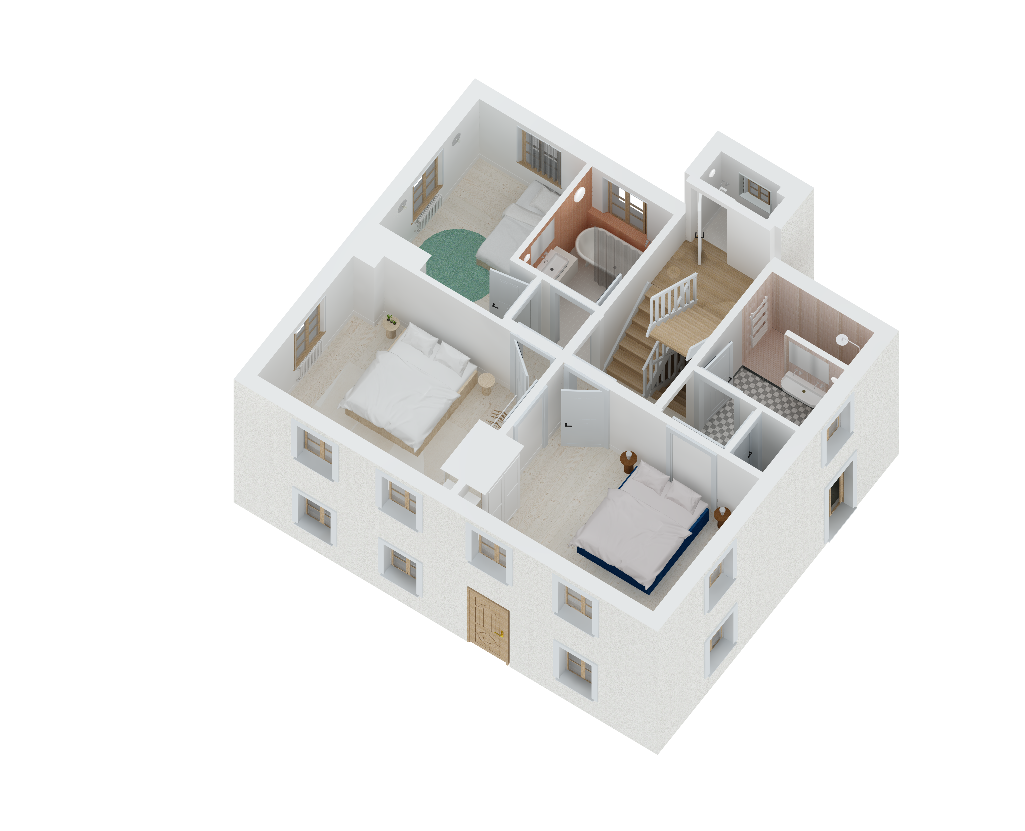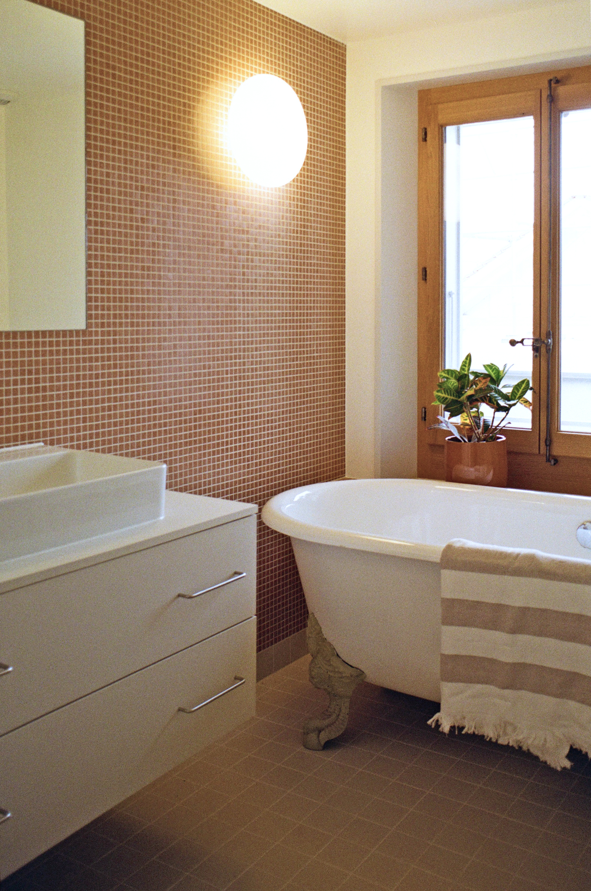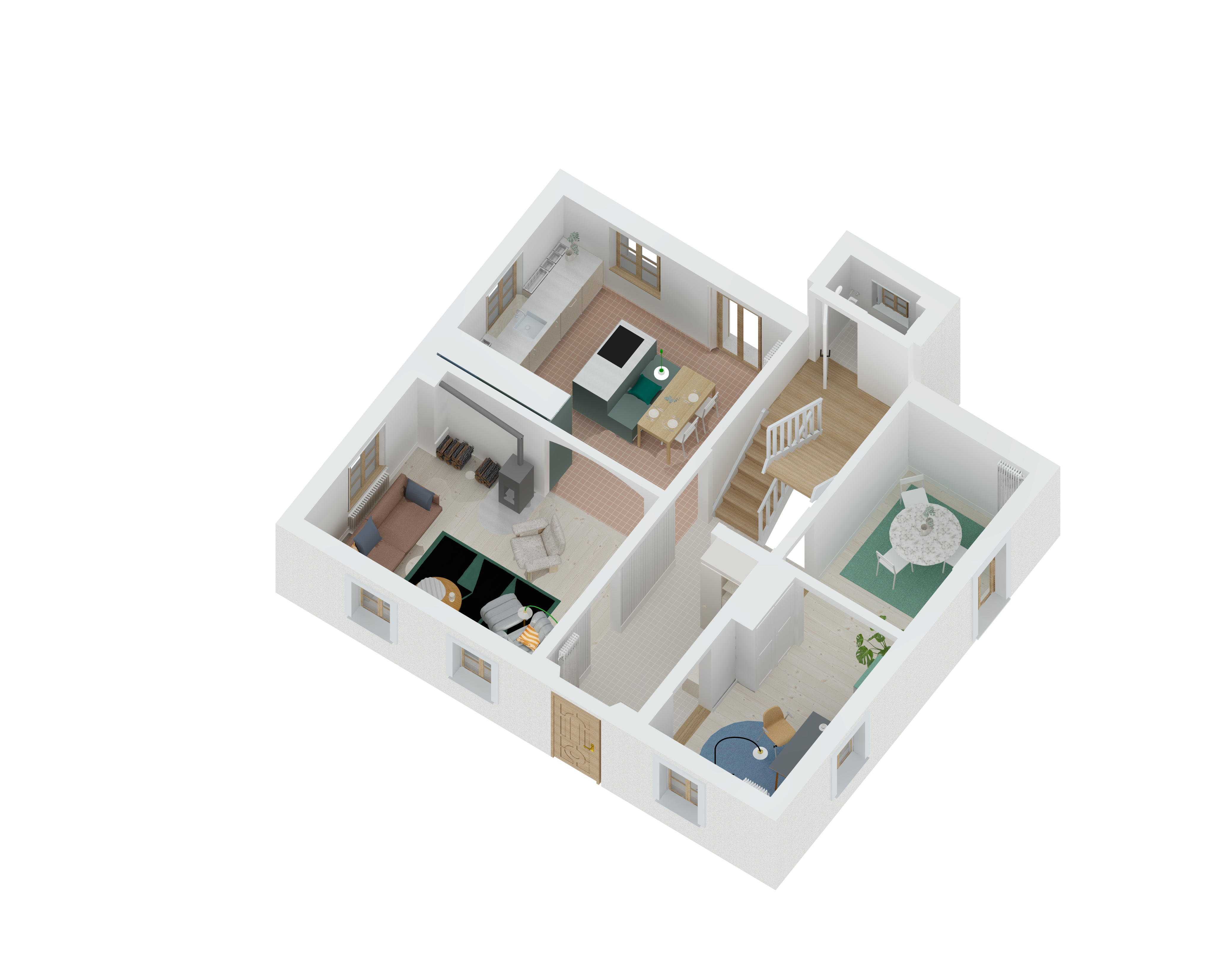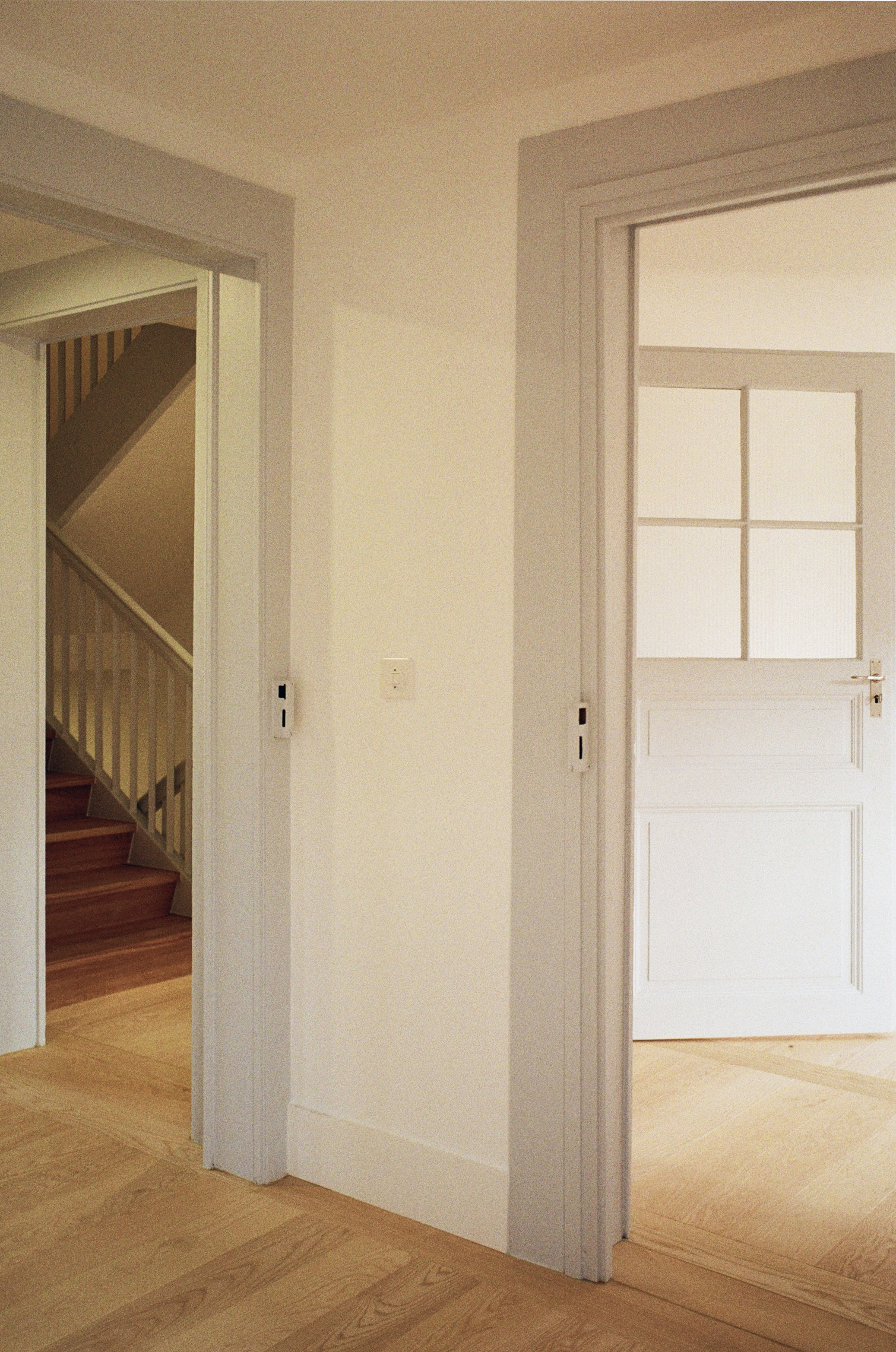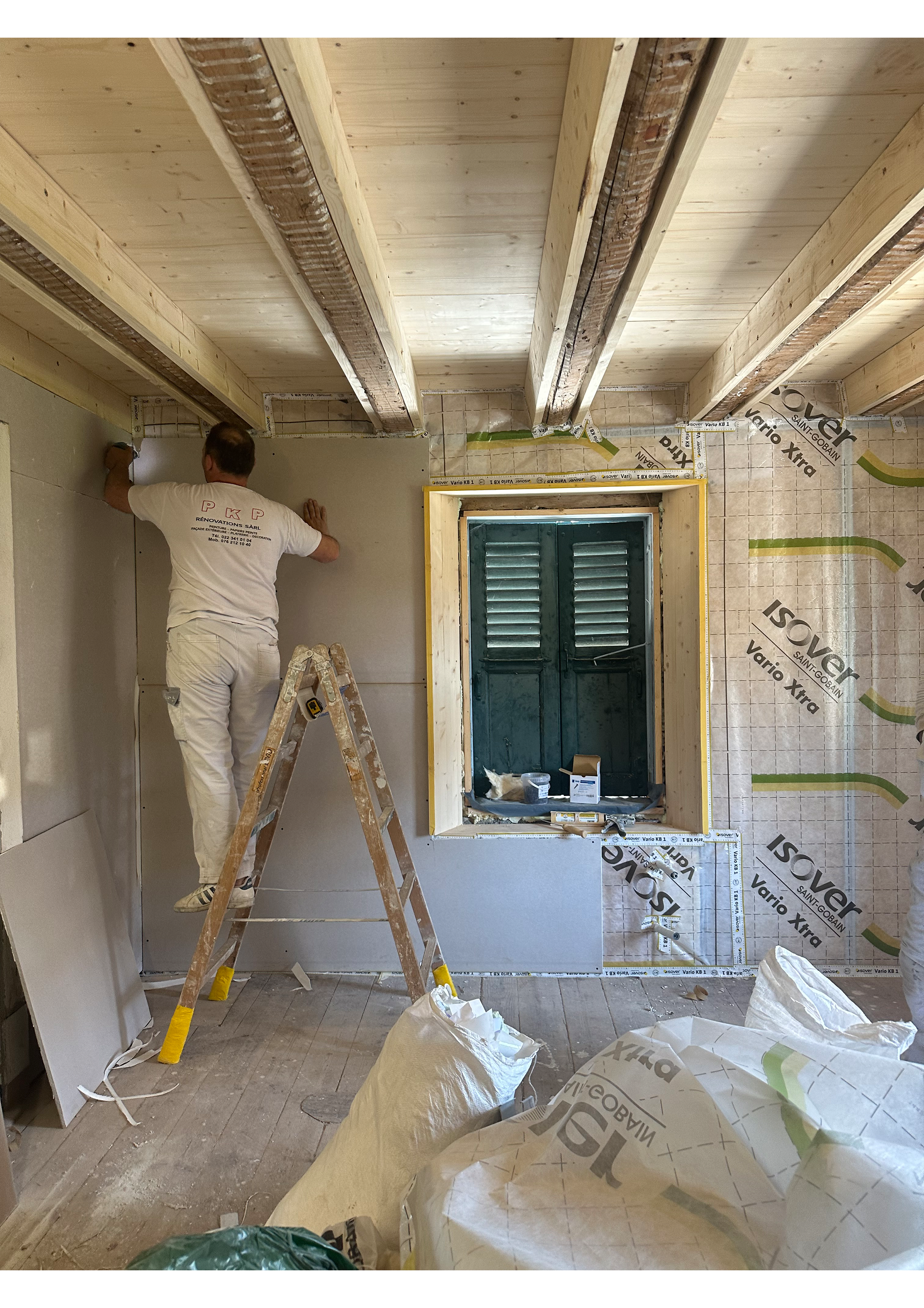 Un soin a été apporté au choix des matériaux pour respecter le langage du bâti alentours et traditionnel : crépis à la chaux, fenêtres à l’ancienne en chêne, … Les éléments existants ont au maximum été conservés et rénovés ou déplacés comme les portes à l’étage qui ont été réutilisées pour la création des nouvelles salles de bain.