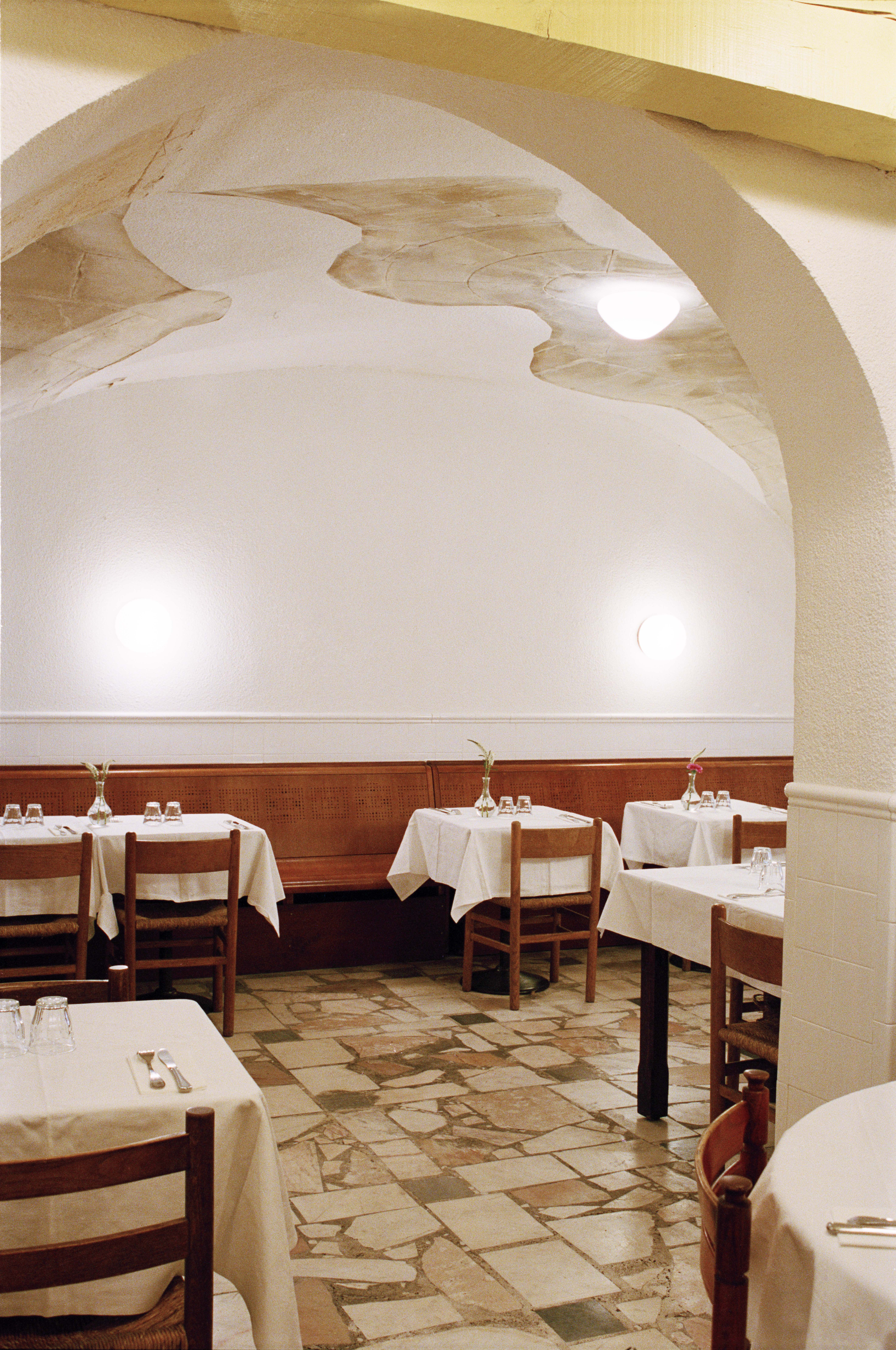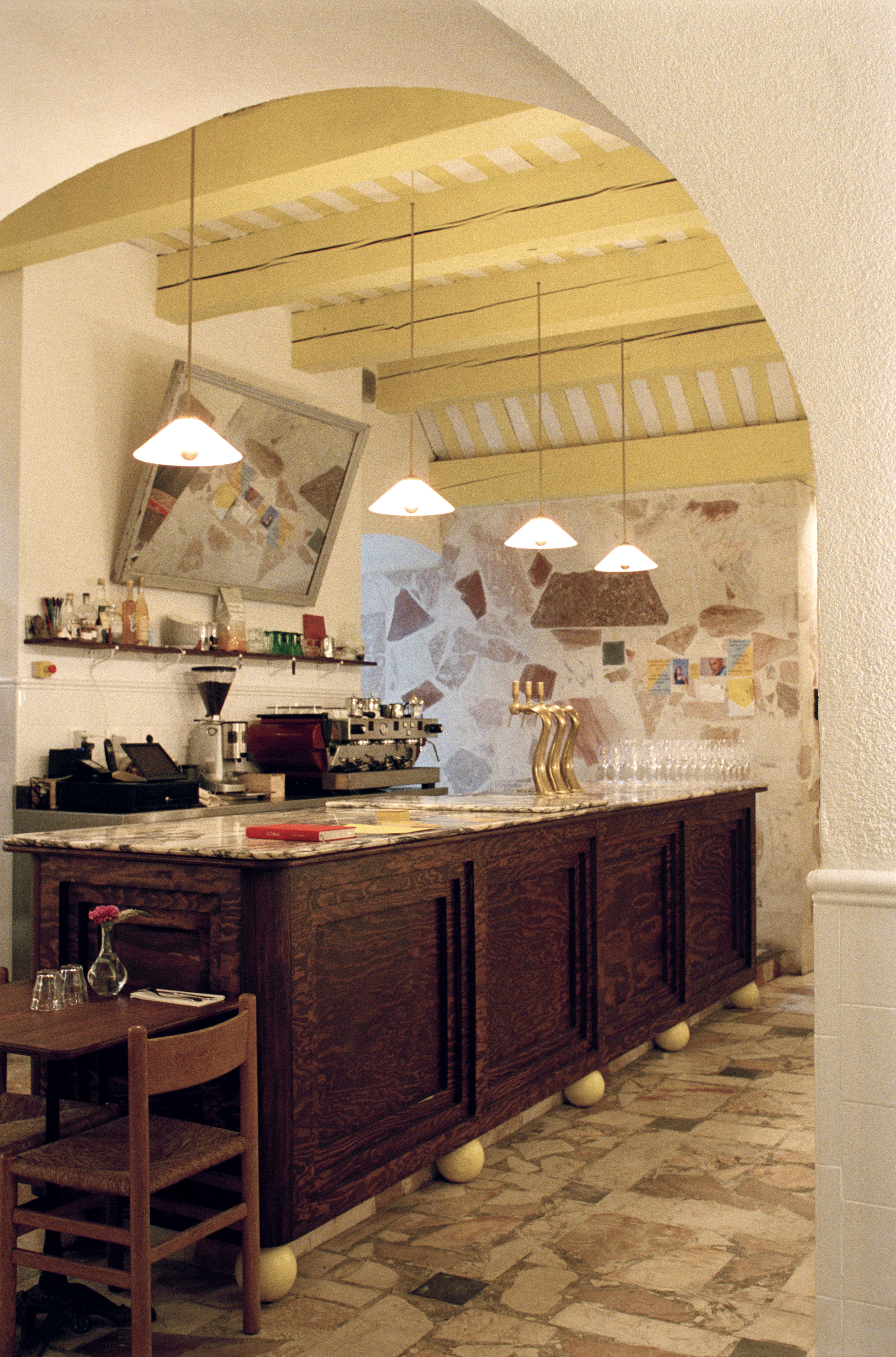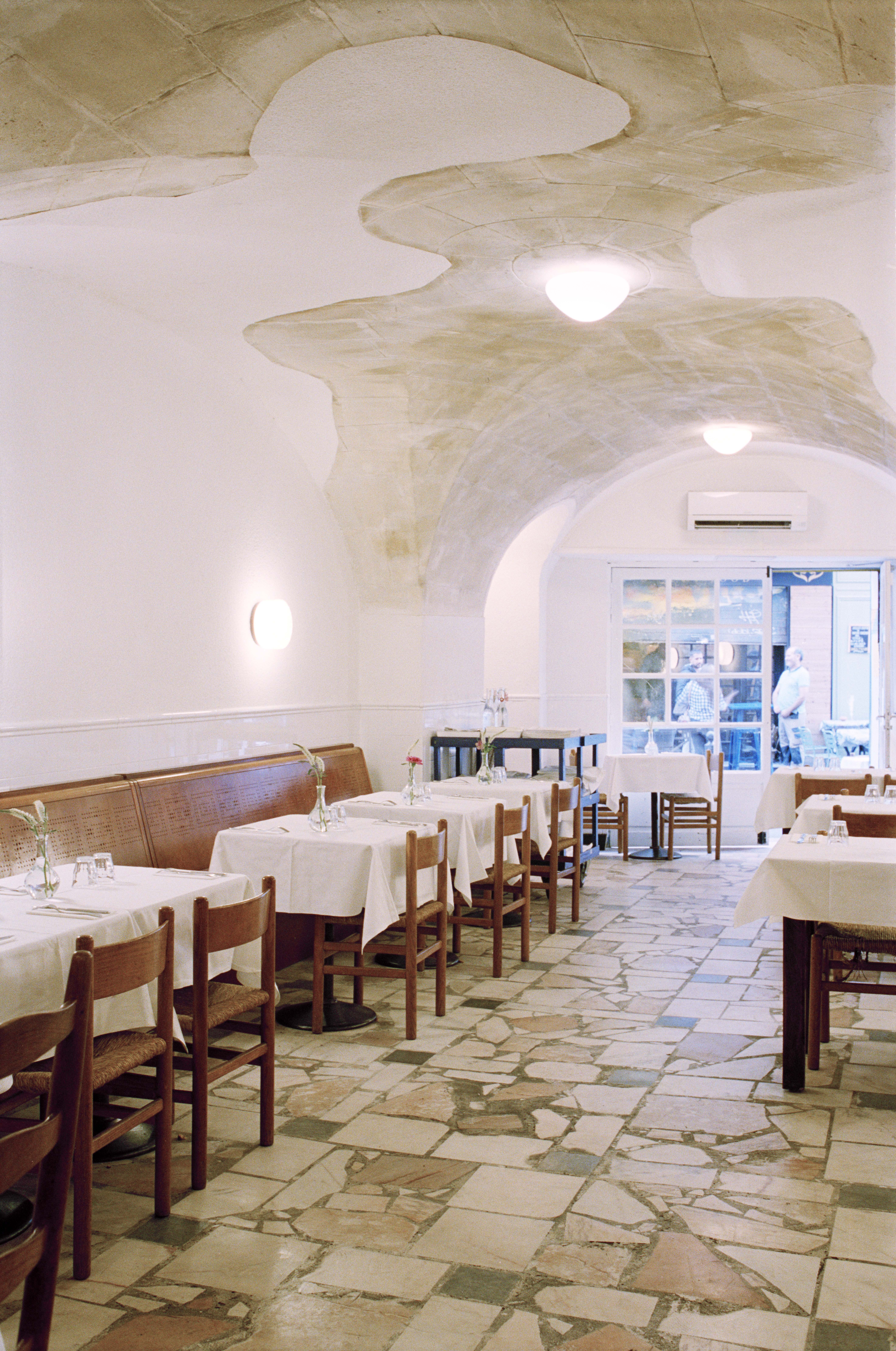 L'Idéal (Marseille, France) est un délicieux collage d'éléments inattendus. Une façade telle qu'elle se présente, du marbre trouvé et, bien sûr, des nappes d'un blanc éclatant. Arches, marbre Calacatta et pin psychédélique, clin d'œil à Ettore Sottsass, évoquent le charme des trattorias italiennes. La cuisine déborde de créativité : les framboises abondent, des rayures crème citron ornent le plafond, avec un soupçon de Gio Ponti à proximité. Un four à bois, un Zizou pratique et une machine à café fumante créent une atmosphère dynamique pendant que le rouget cuit. Une fresque à la Jérôme Bosch - ou presque - ajoute à l'ambiance éclectique. Tout le reste est servi à table.