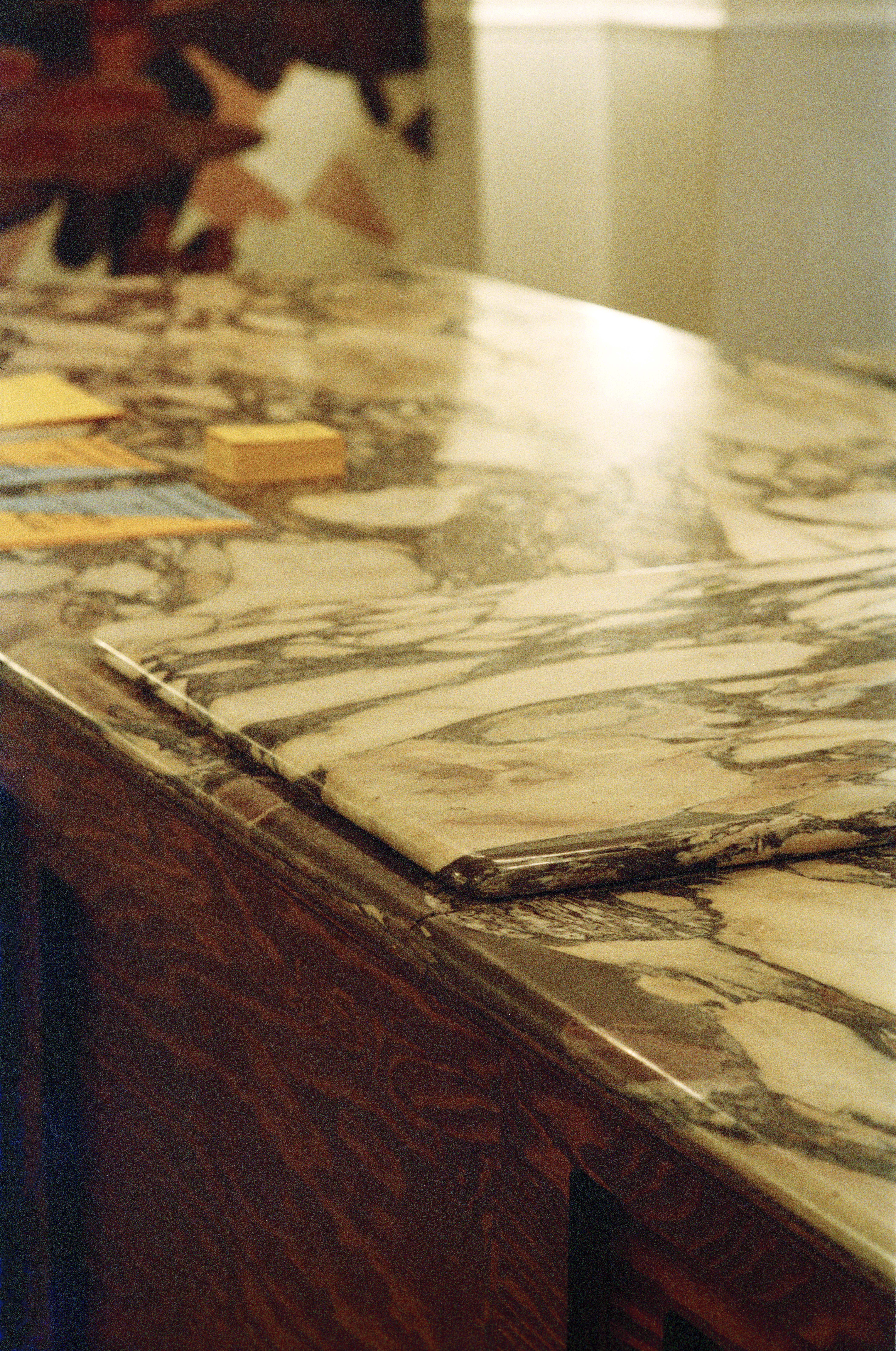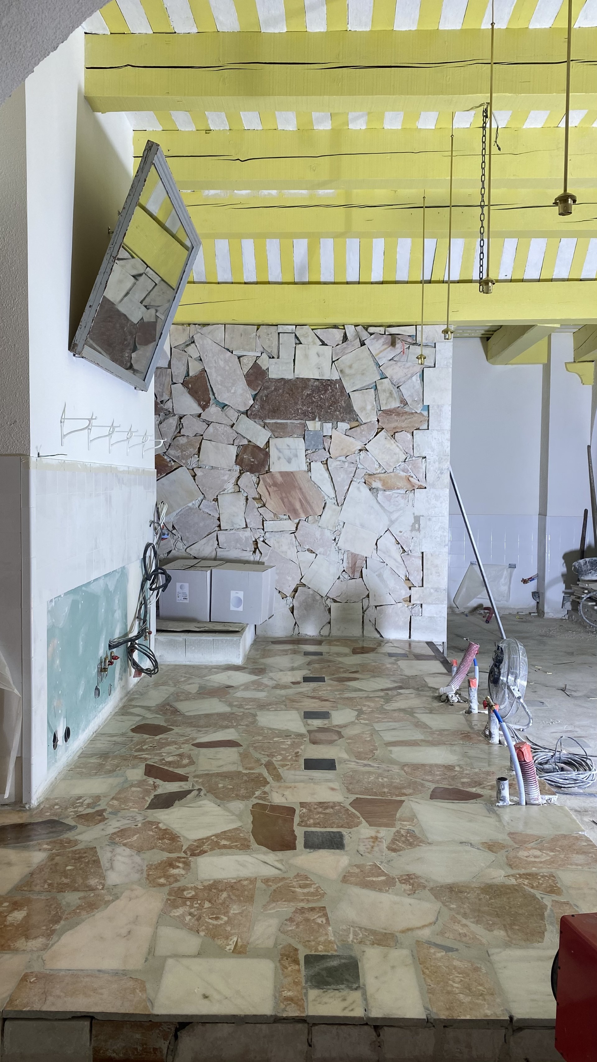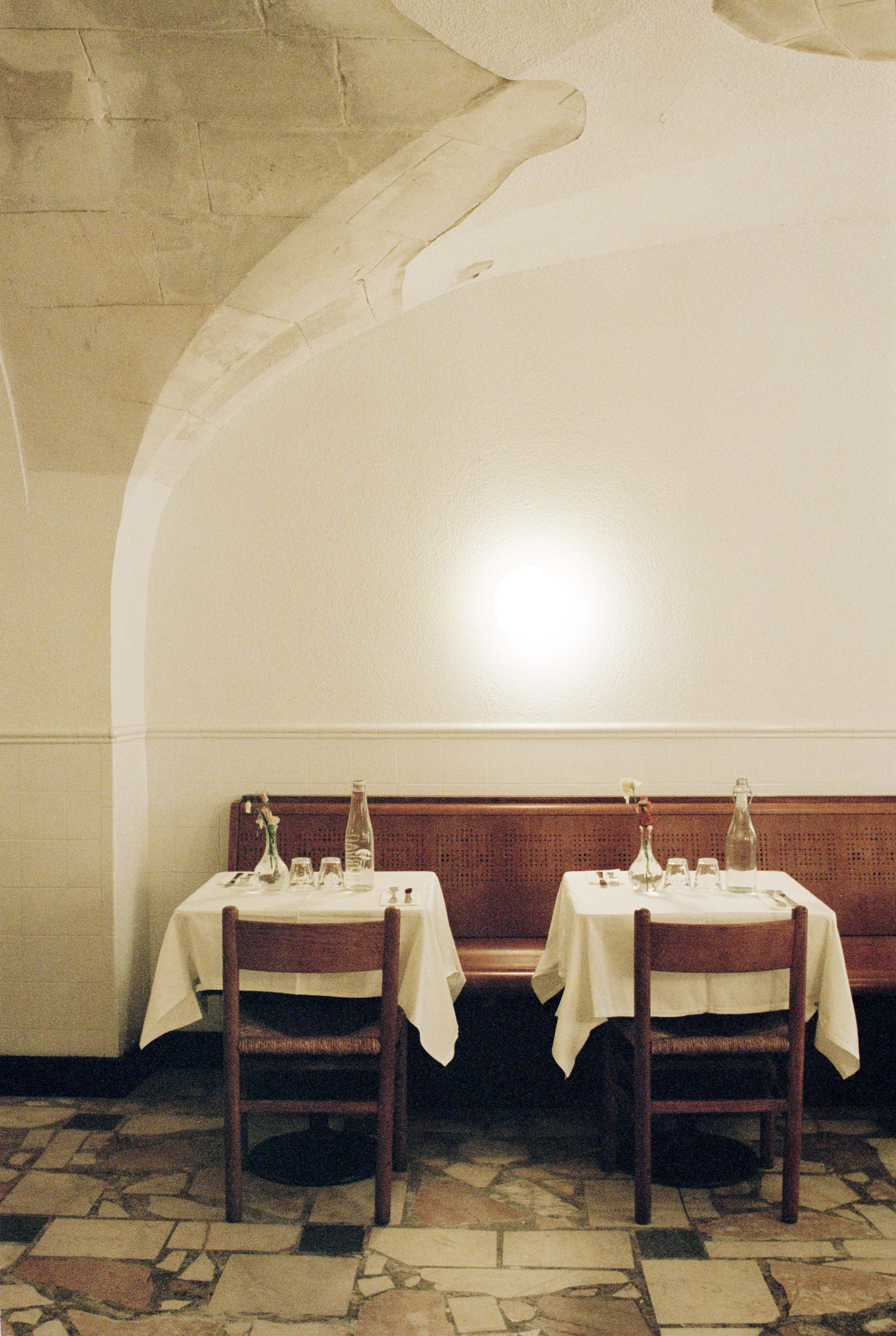 L'Idéal (Marseille, France) est un délicieux collage d'éléments inattendus. Une façade telle qu'elle se présente, du marbre trouvé et, bien sûr, des nappes d'un blanc éclatant. Arches, marbre Calacatta et pin psychédélique, clin d'œil à Ettore Sottsass, évoquent le charme des trattorias italiennes. La cuisine déborde de créativité : les framboises abondent, des rayures crème citron ornent le plafond, avec un soupçon de Gio Ponti à proximité. Un four à bois, un Zizou pratique et une machine à café fumante créent une atmosphère dynamique pendant que le rouget cuit. Une fresque à la Jérôme Bosch - ou presque - ajoute à l'ambiance éclectique. Tout le reste est servi à table.