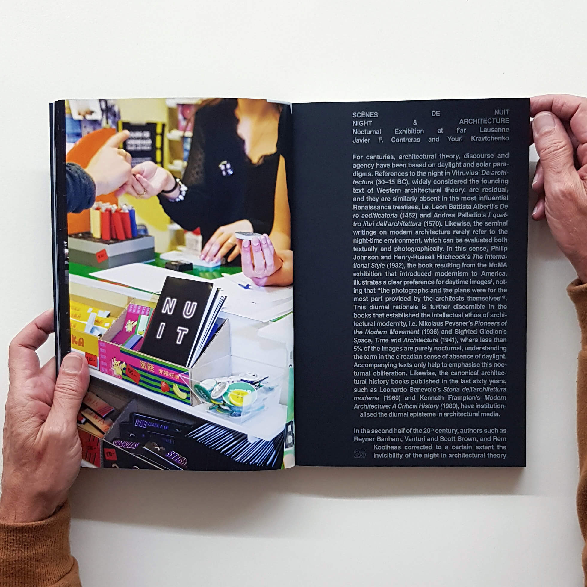 « Scènes de nuit » examine le rôle de la nuit dans la construction des villes et des sociétés contemporaines, en se demandant si la théorie et la critique architecturales sont encore principalement associées à la lumière du soleil et aux paradigmes diurnes. Le livre, un catalogue résultant de l'exposition éponyme tenue à f'ar Lausanne en 2019 sous le commissariat de Javier F. Contreras et Youri Kravtchenko, réfléchit sur les espaces, les activités et les médias déployés dans la culture nocturne, en utilisant les photographies, les séquences, les enregistrements et les transcriptions disponibles comme principal matériel éditorial.