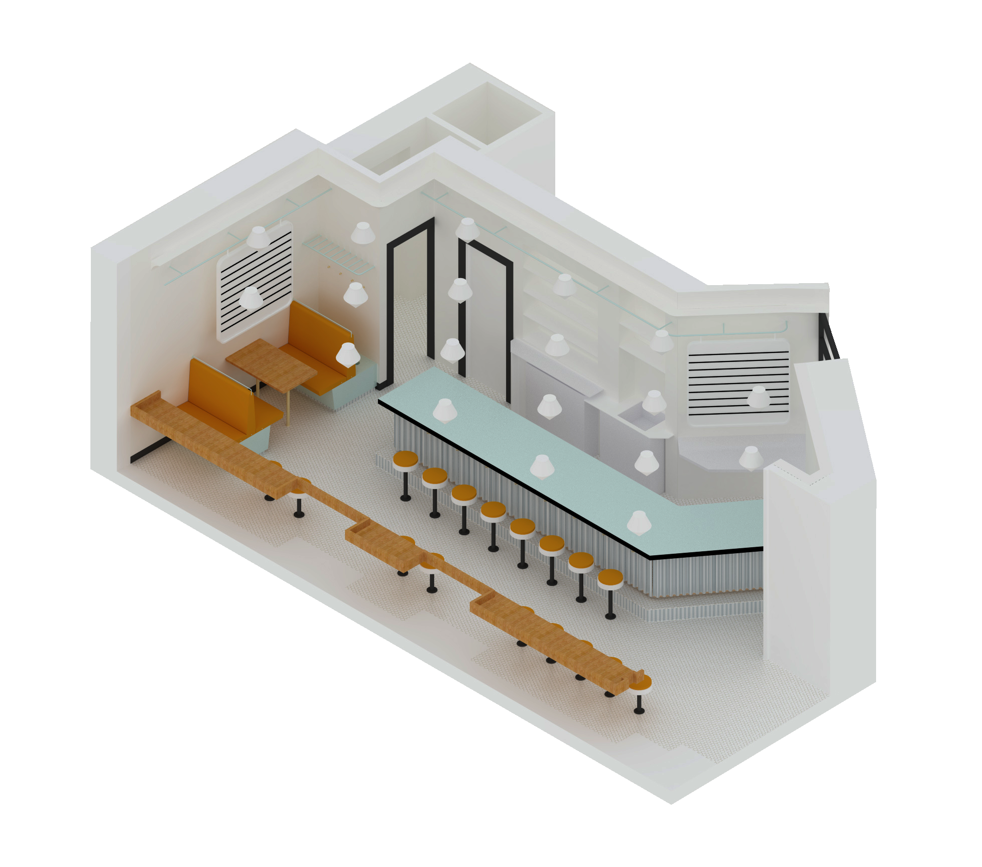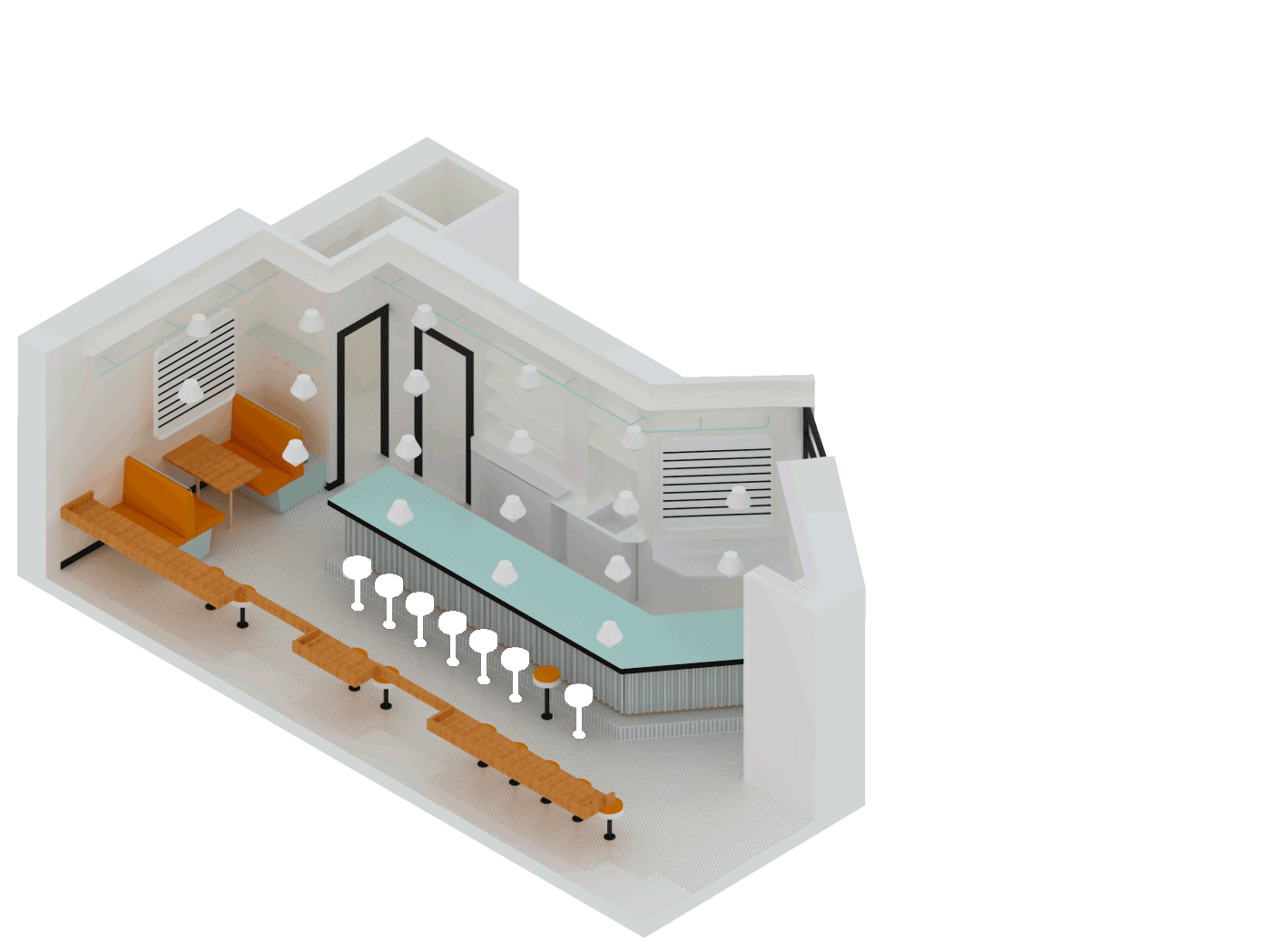 Cet espace transporte les visiteurs dans un voyage temporel, revisitant les traditions américaines avec une touche contemporaine. Il recrée l’atmosphère des diners des années 1960, enrichie d’une note européenne. Le décor est dominé par un turquoise typique de l’époque, avec un sol en damier noir et blanc et des banquettes aux lignes rétro. L’esprit du diner se retrouve dans des éléments nostalgiques modernisés, comme les tables en formica et les tabourets en métal habillés de cuir cognac.
